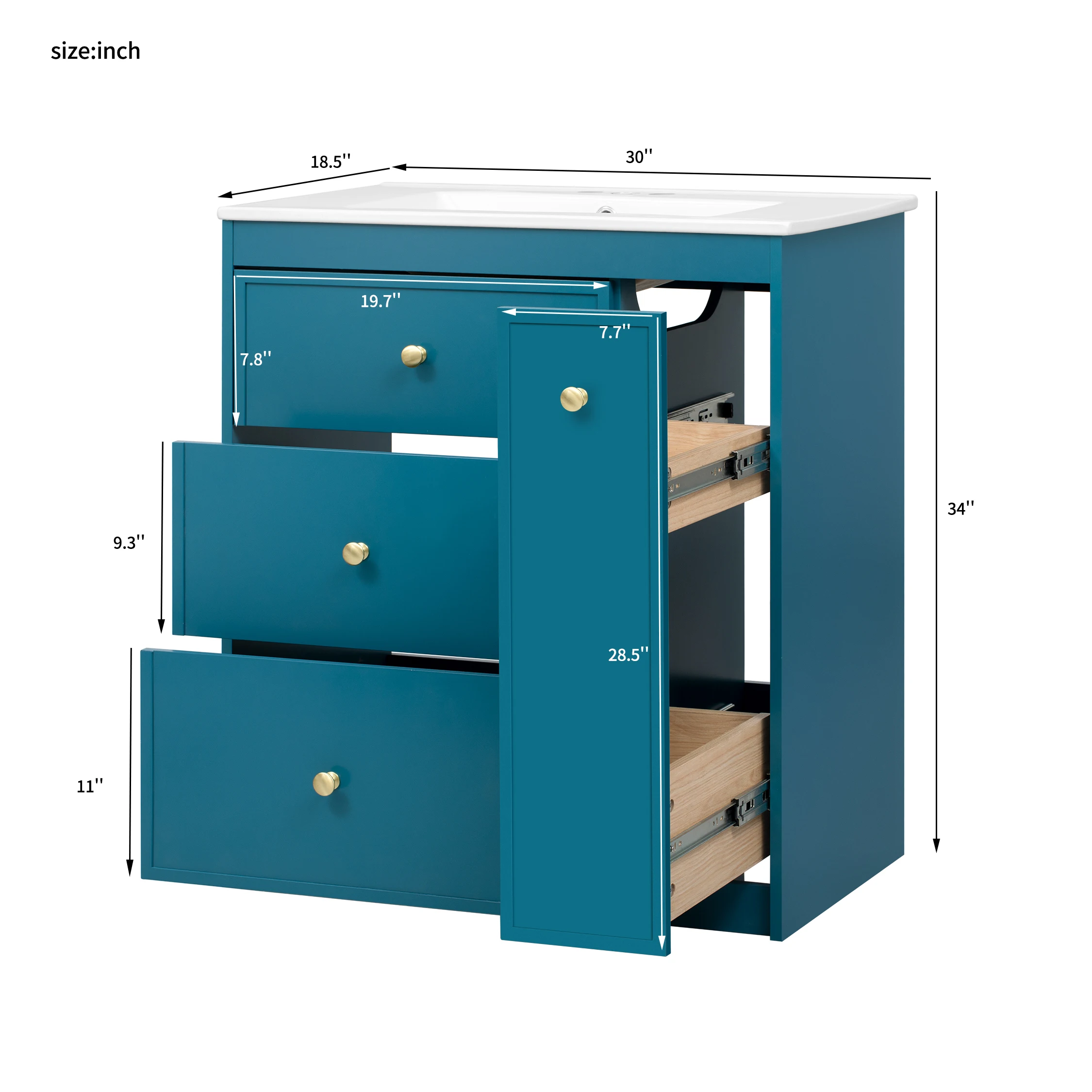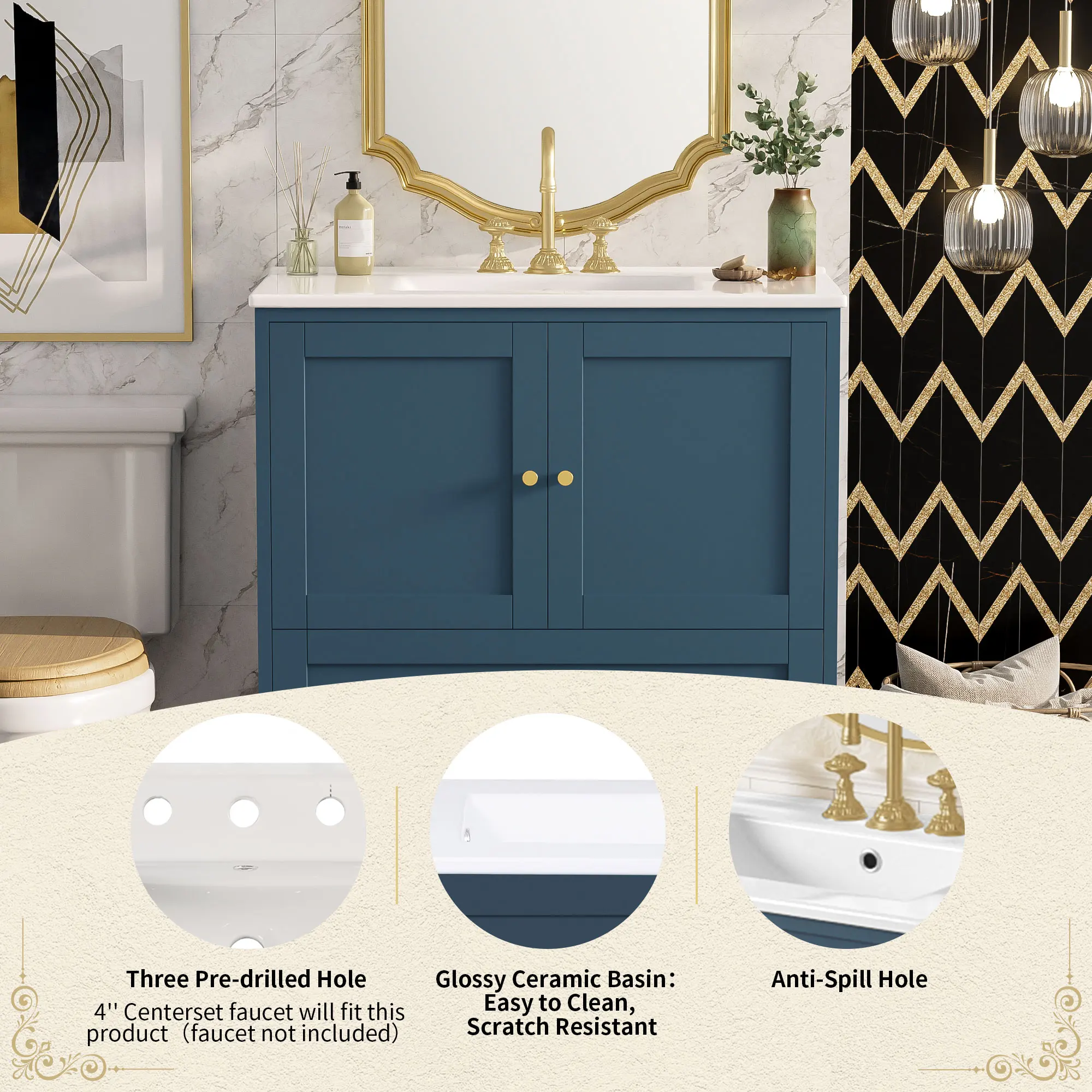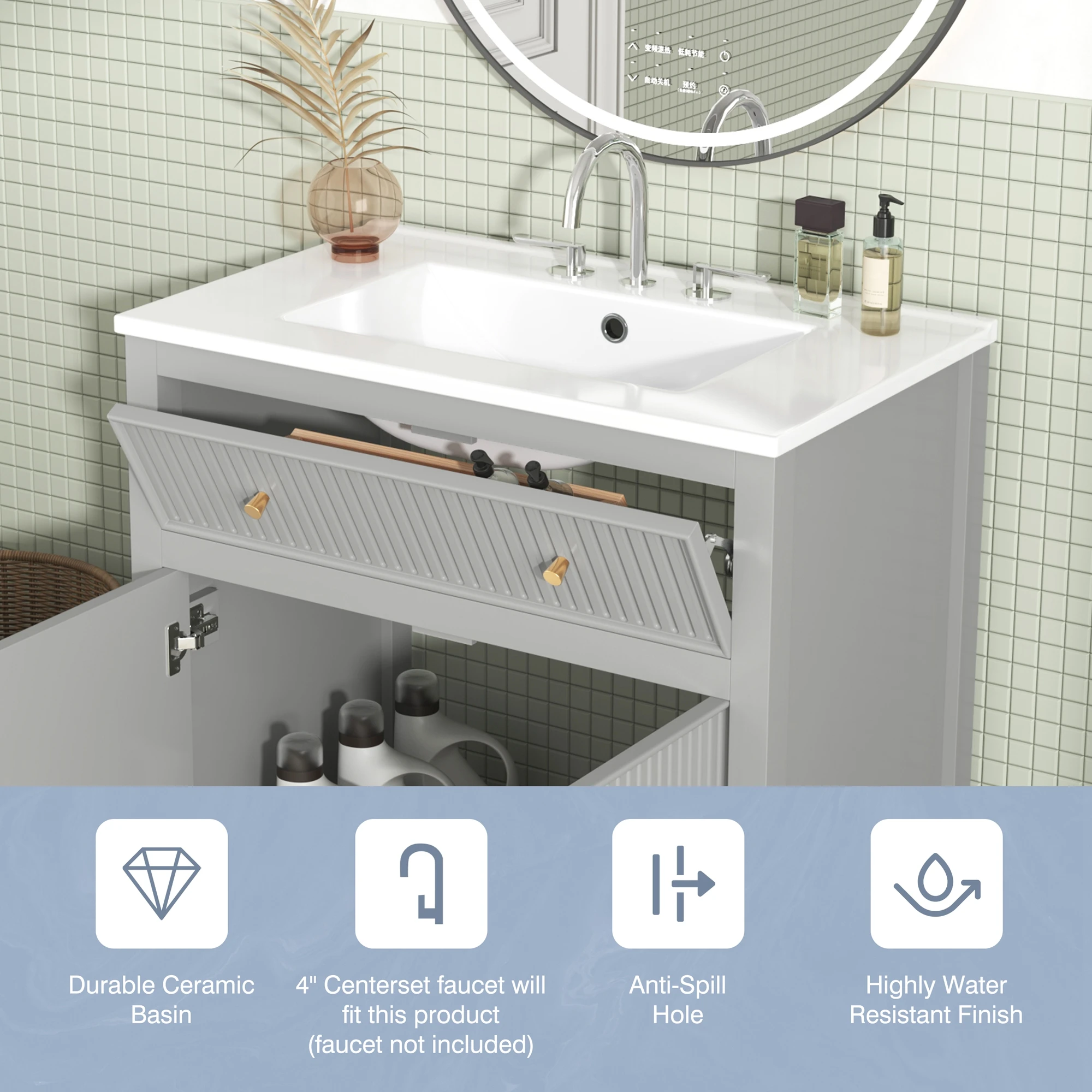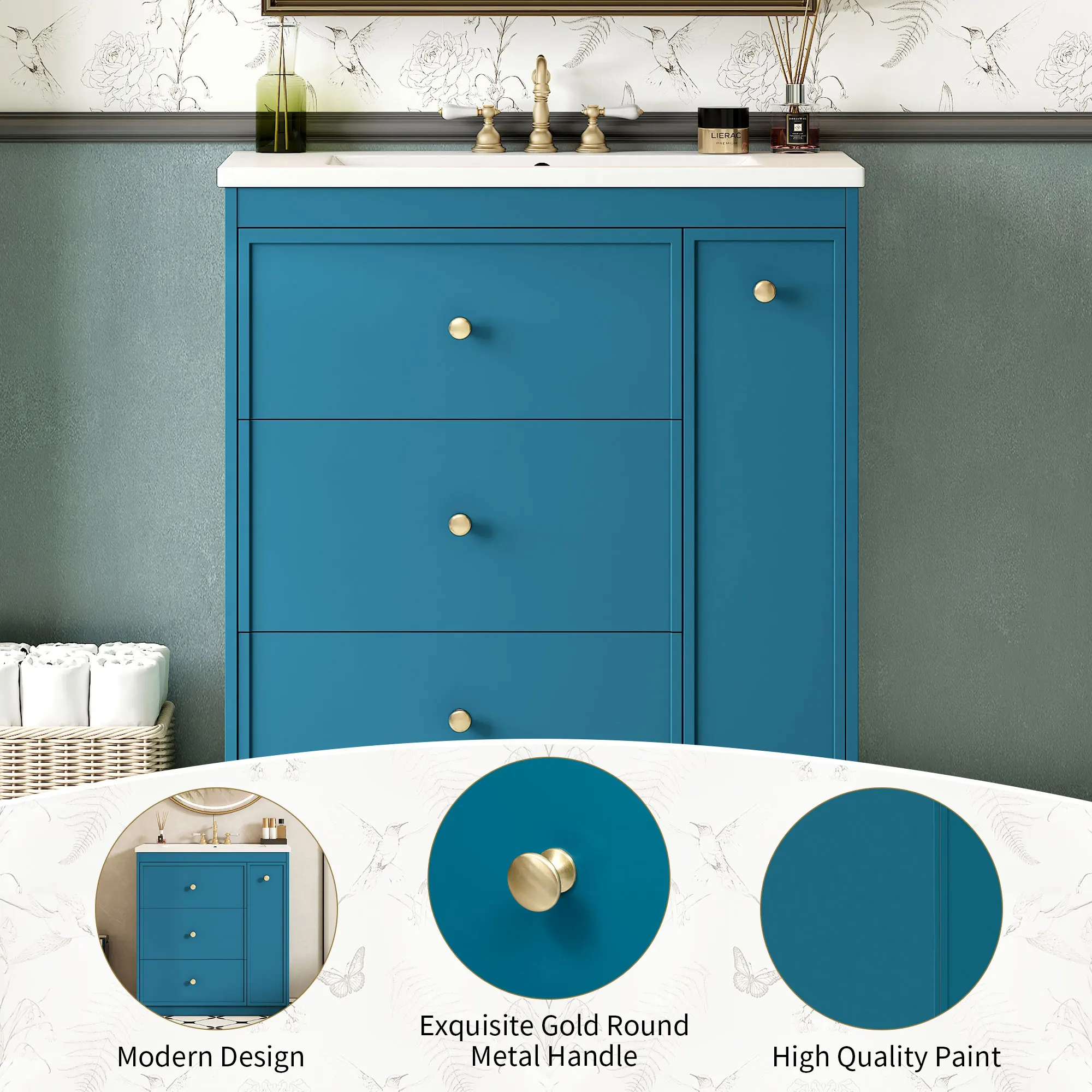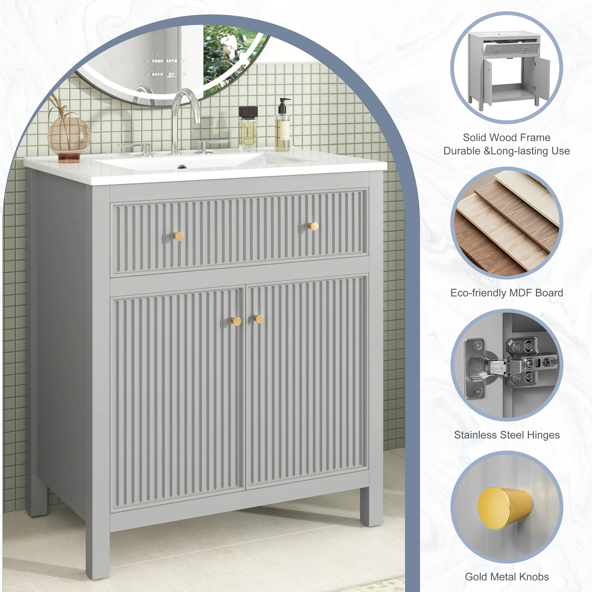 Bathroom Vanity with Ceramic Sink Combo, Modern Freestanding Storage Cabinet with Gold Handles, Soft Closing Doors