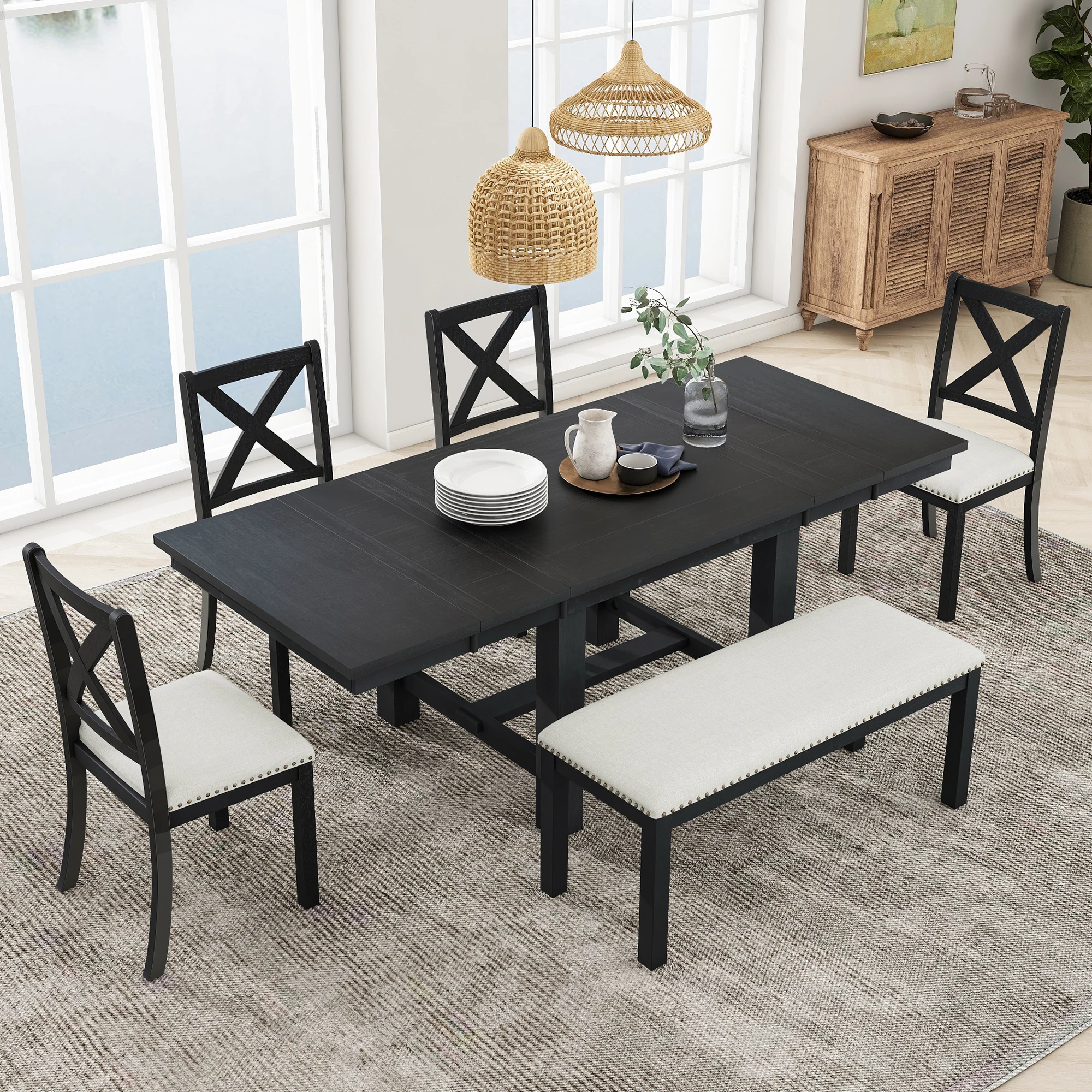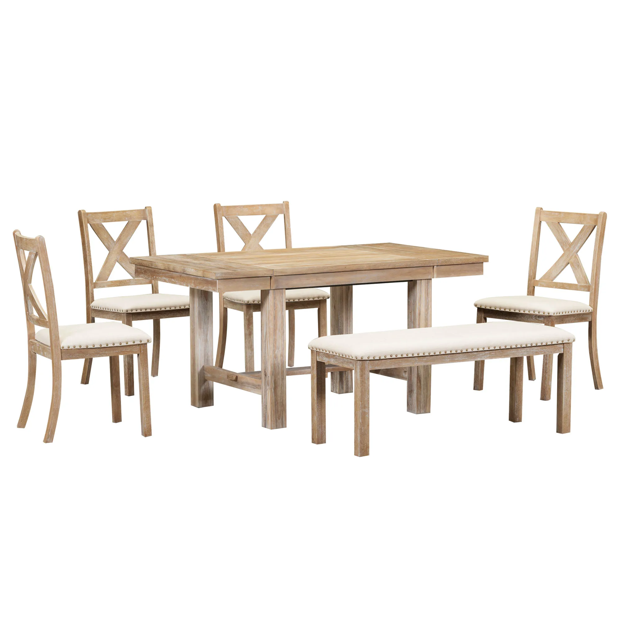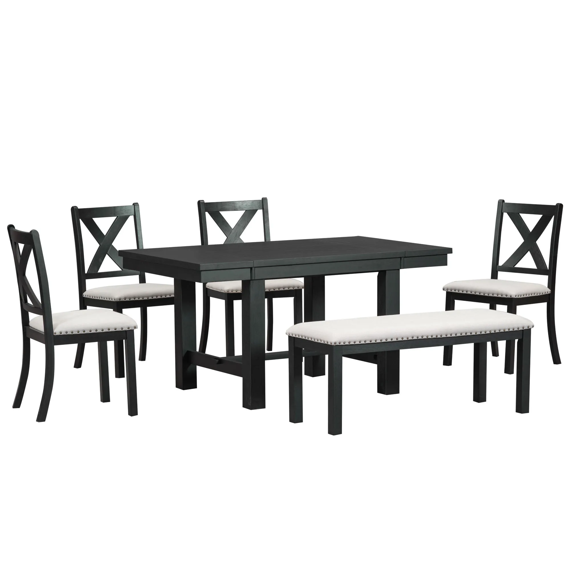 Farmhouse 82inch 6-Piece Extendable Dining Table with Footrest, 4 Upholstered Dining Chairs and Dining Bench, Two 11"Removable L