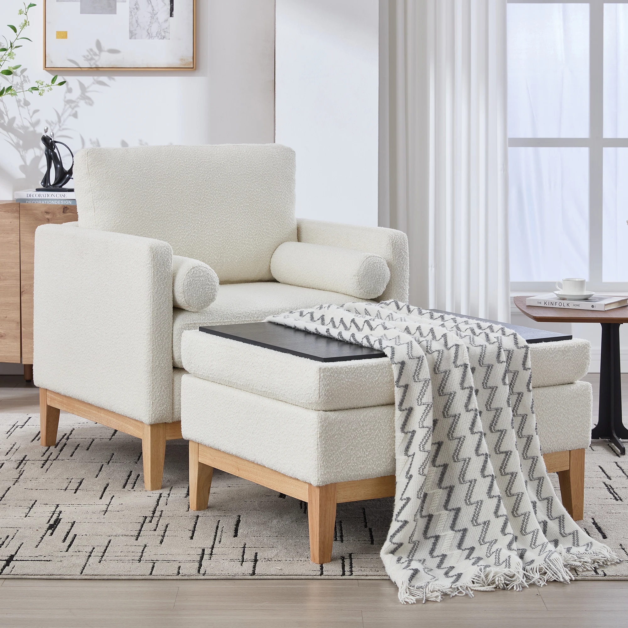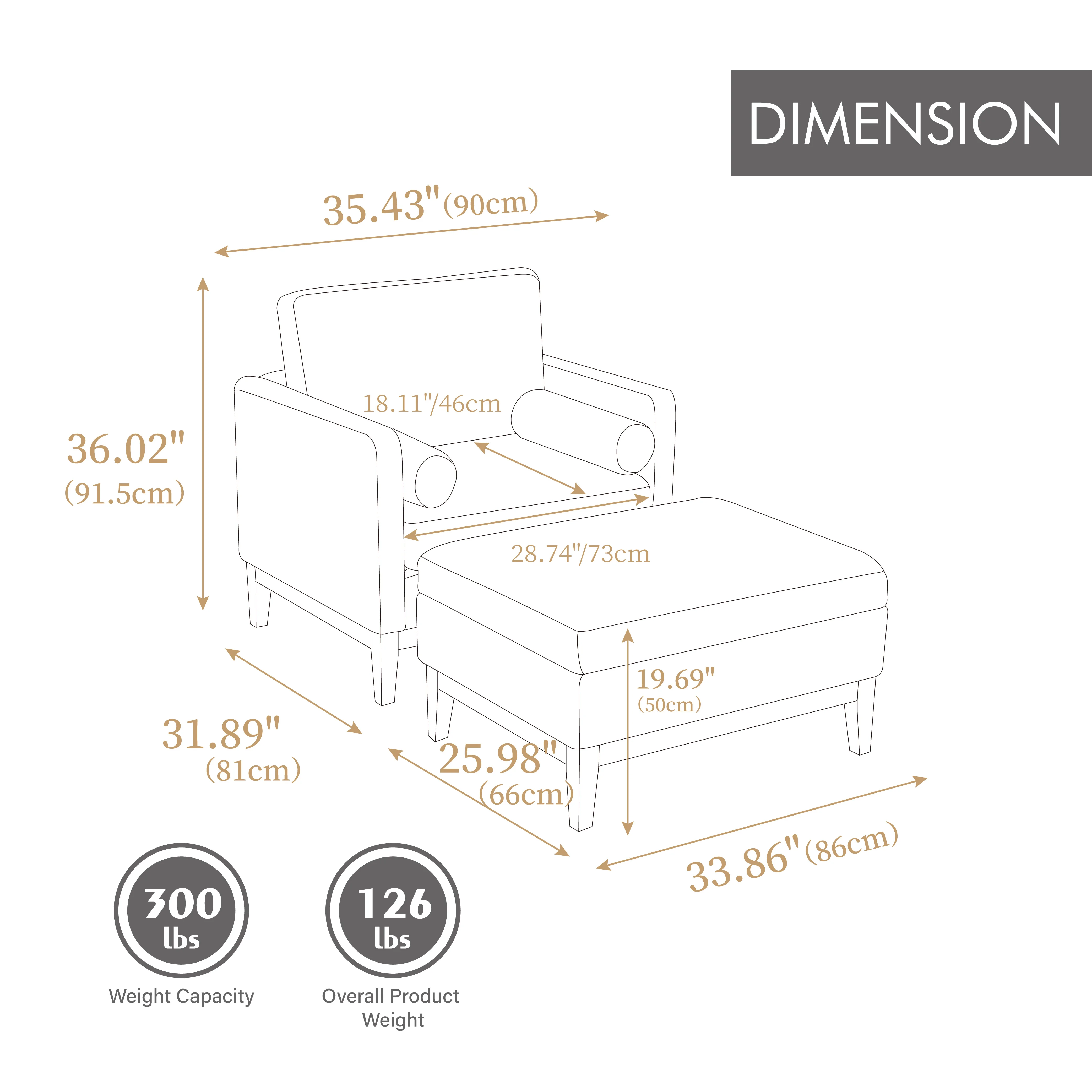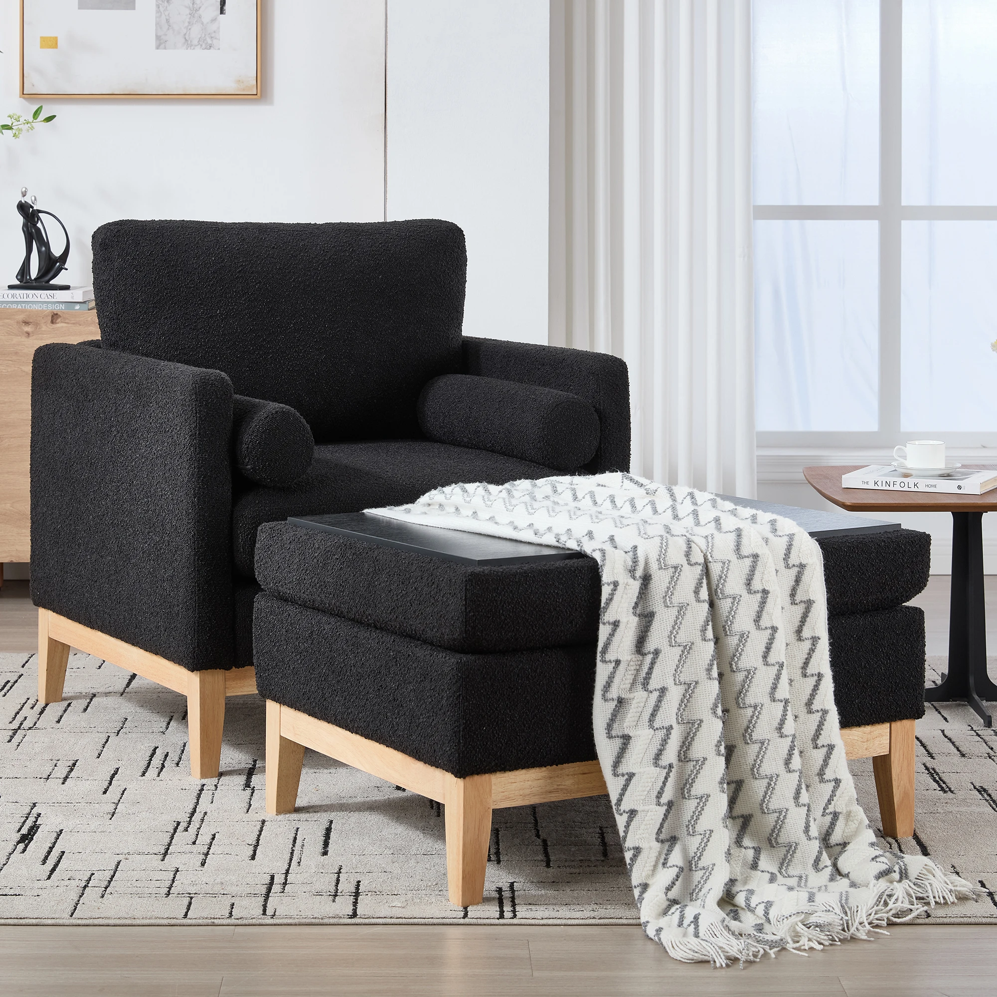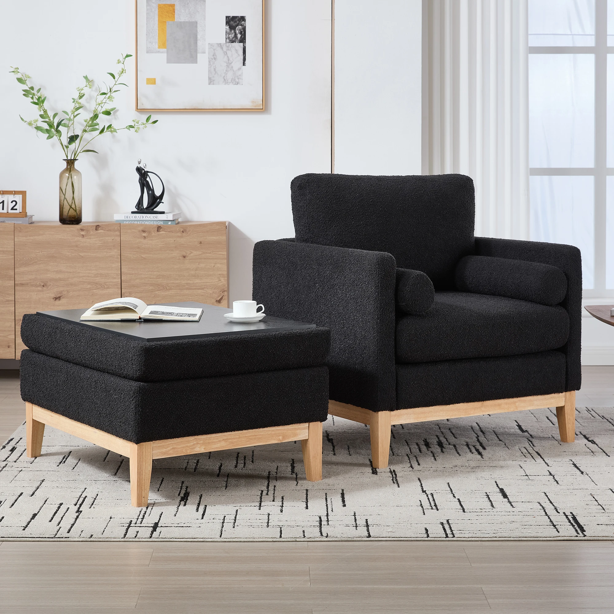 Farmhouse Performance Upholstered Wood Base Square Accent Arm Chair with Ottoman Black Finish Legs.