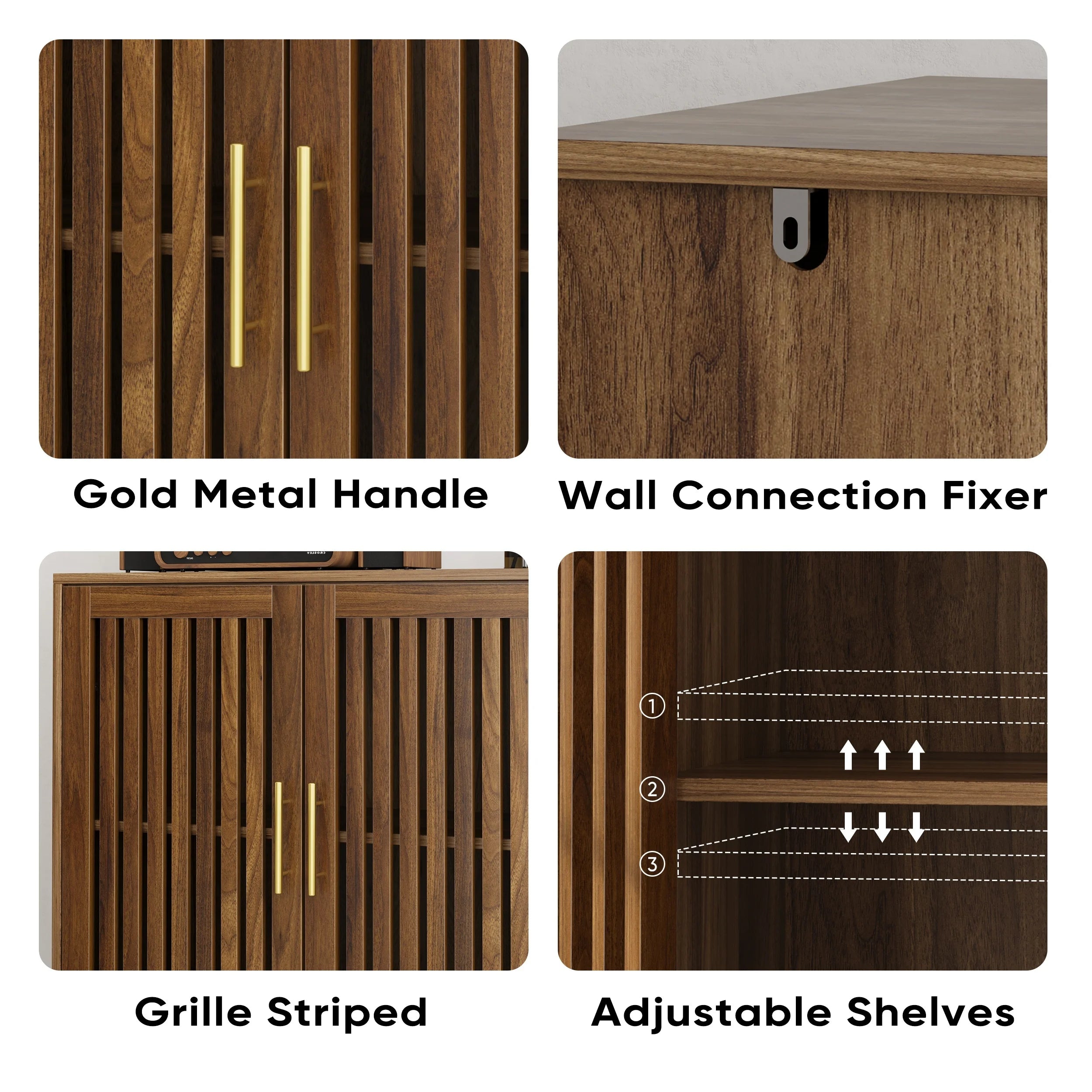 This versatile sideboard buffet cabinet brings a touch of modern farmhouse style to any room in your home. Designed with louvered doors and a walnut finish, it serves as a functional storage solution for your kitchen, dining room, living room, or entryway. With spacious compartments and adjustable shelves, it provides ample storage for kitchen essentials, decorative items, or small appliances. Its sturdy construction ensures stability, and the anti-tip feature enhances safety, making it suitable for homes with children or pets.