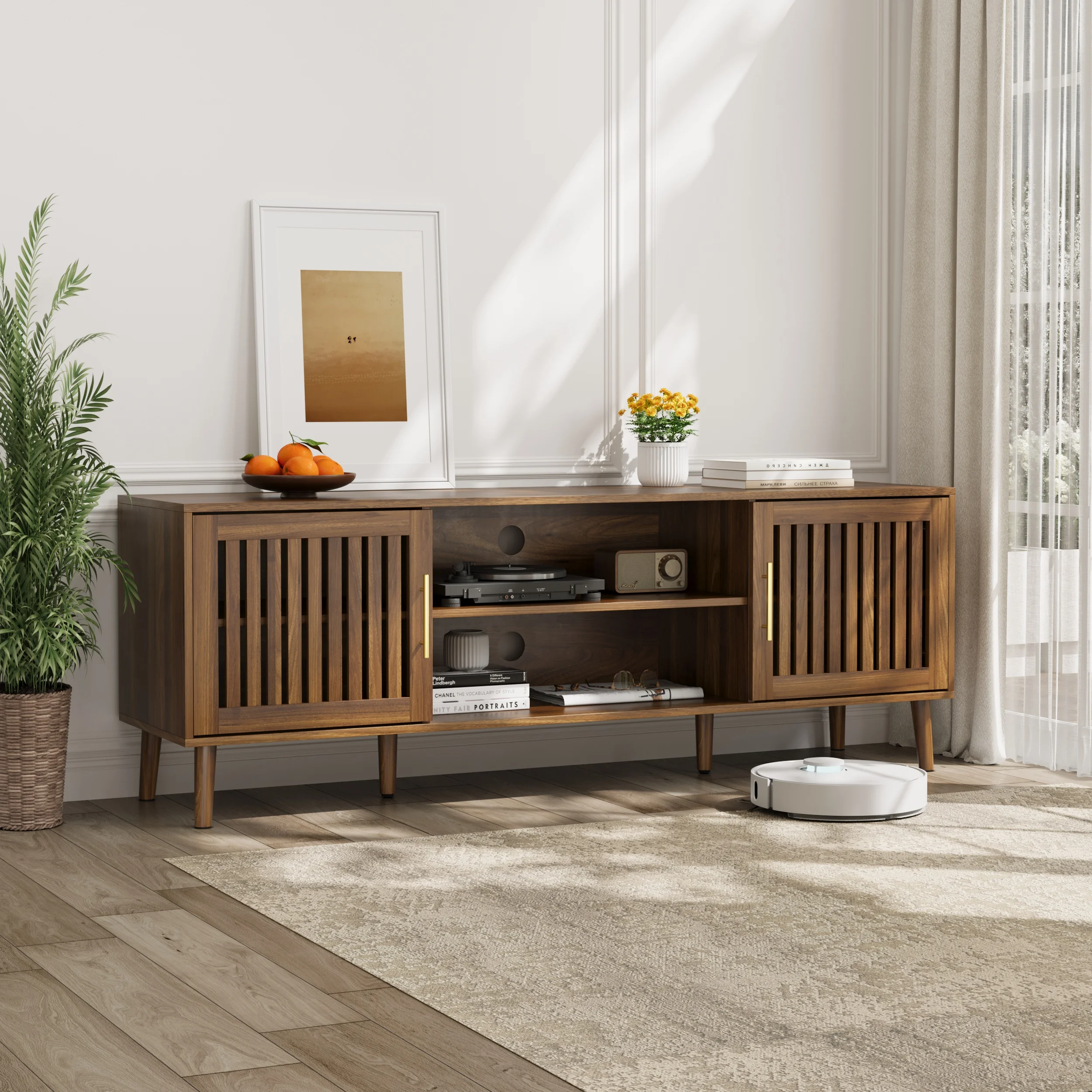Farmhouse Walnut Sideboard Buffet Cabinet with Louvered Doors, Wood Coffee Bar Storage for Kitchen & Living Room