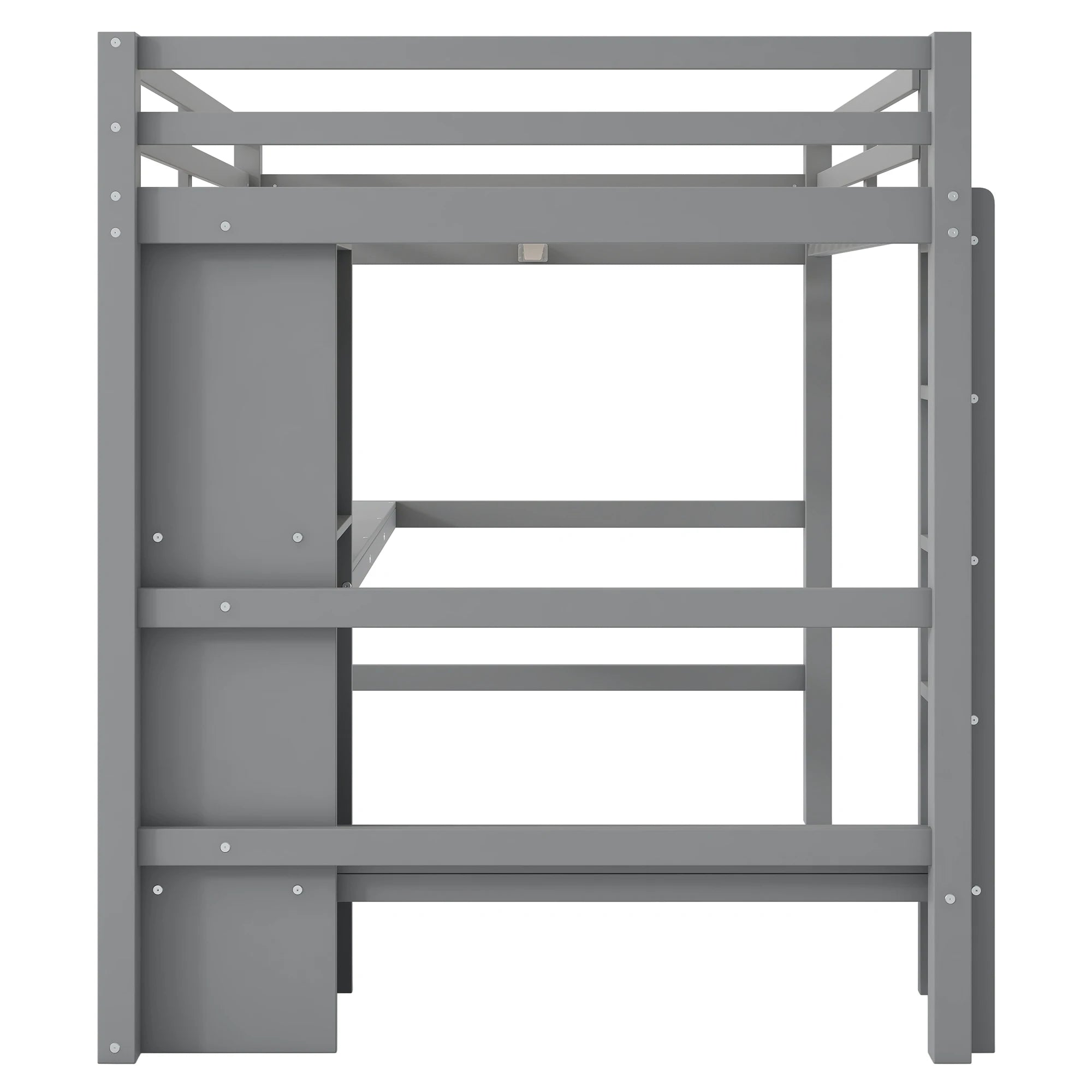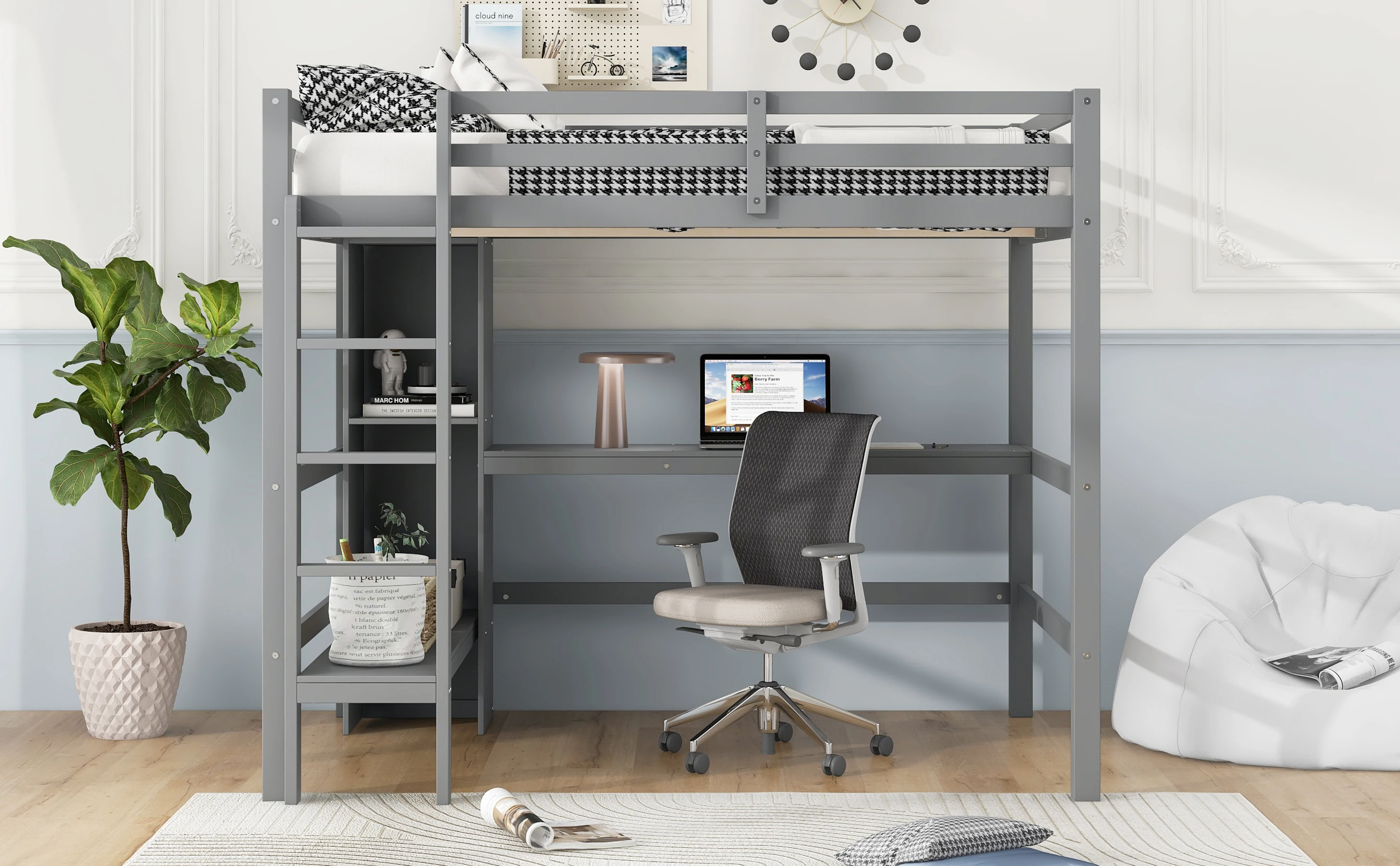 Full Size Loft Bed with Multifunction Shelves and Under-bed Desk