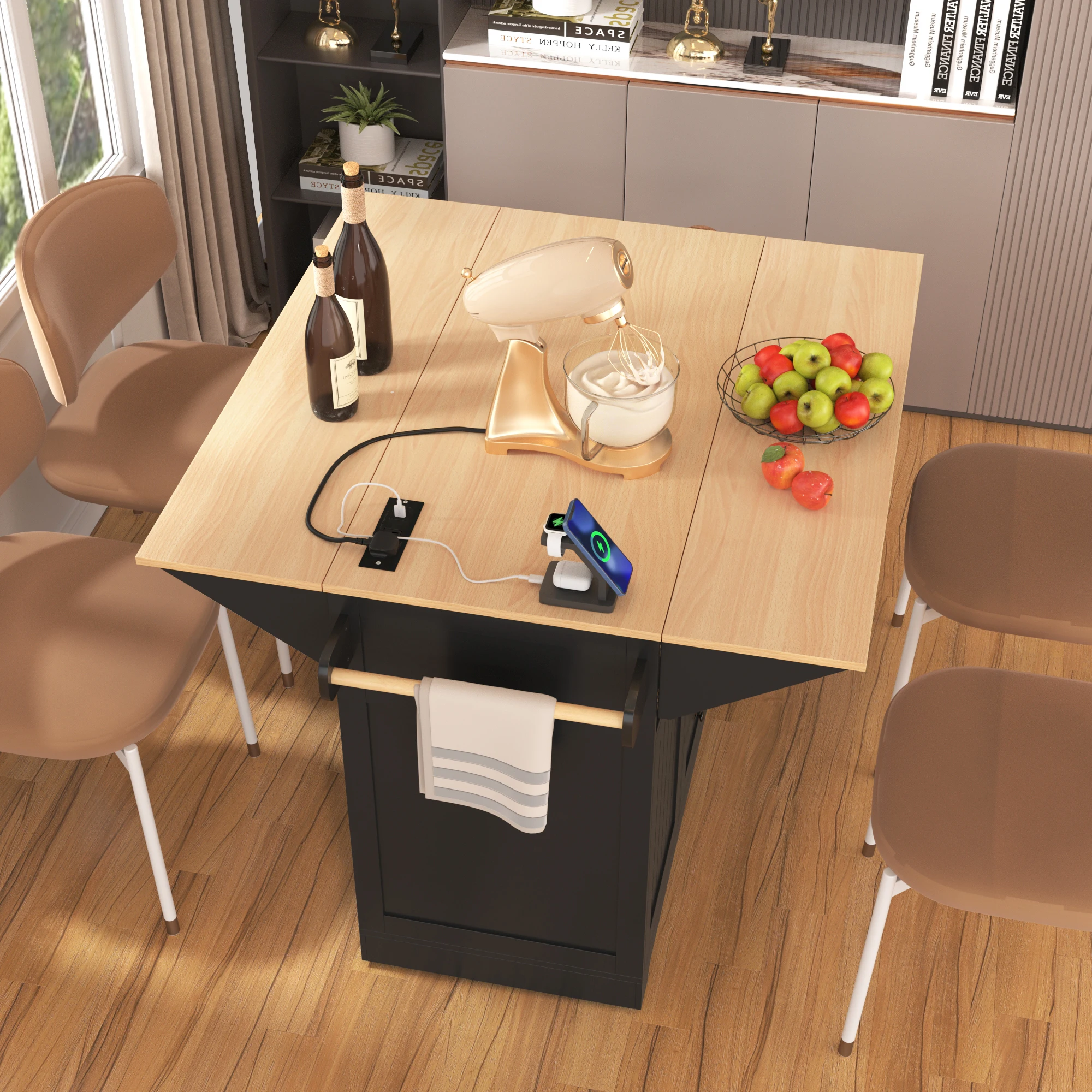 Kitchen Island with 2 Drop Leaf for 4-6 Seating, Rolling Kitchen Cart on 5 Wheels with Power Outlet