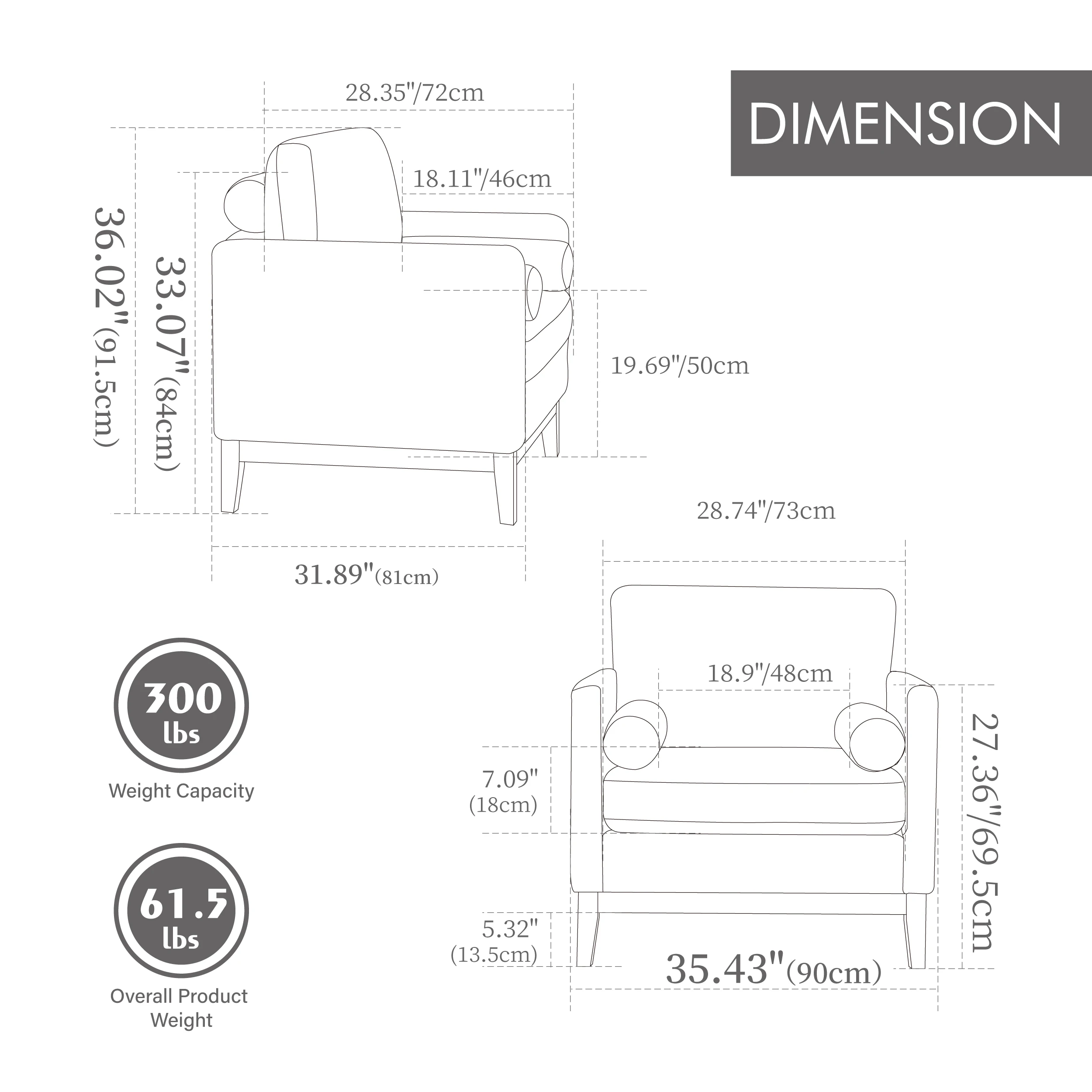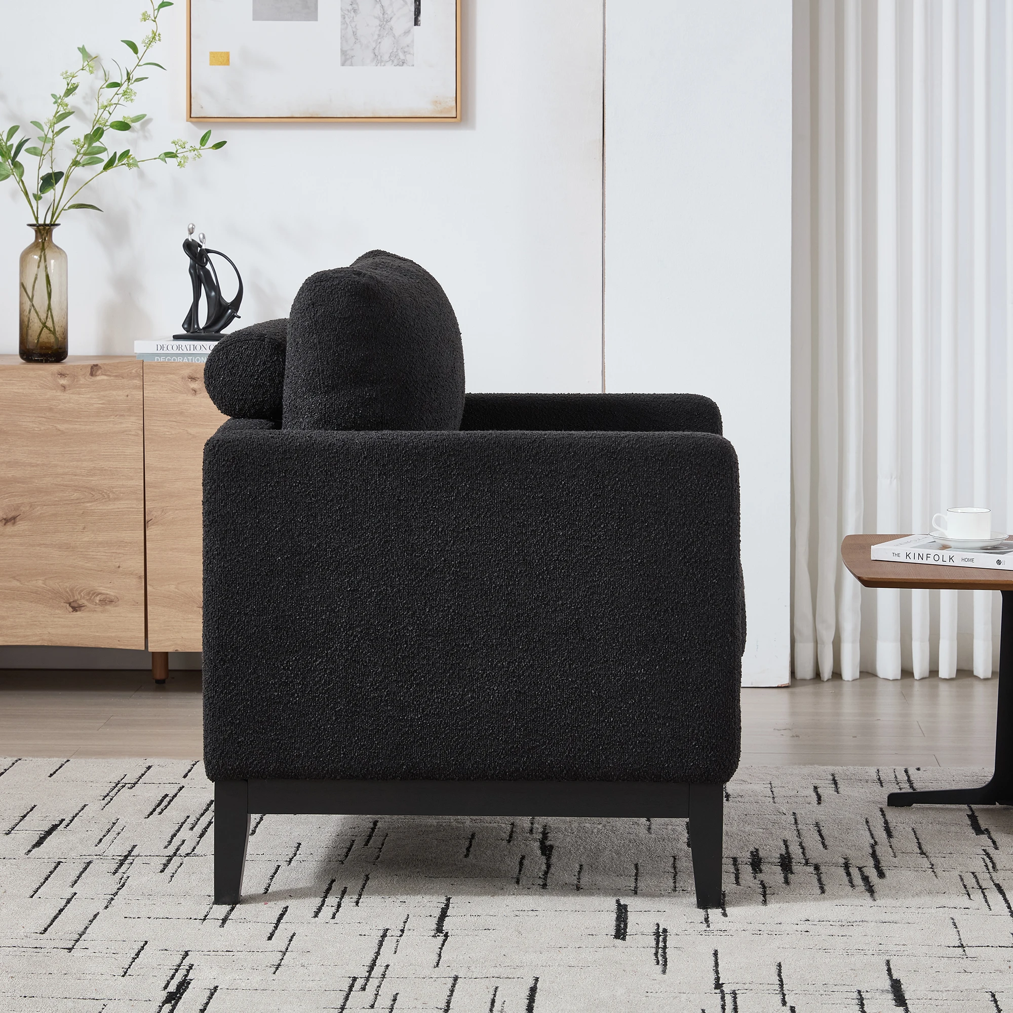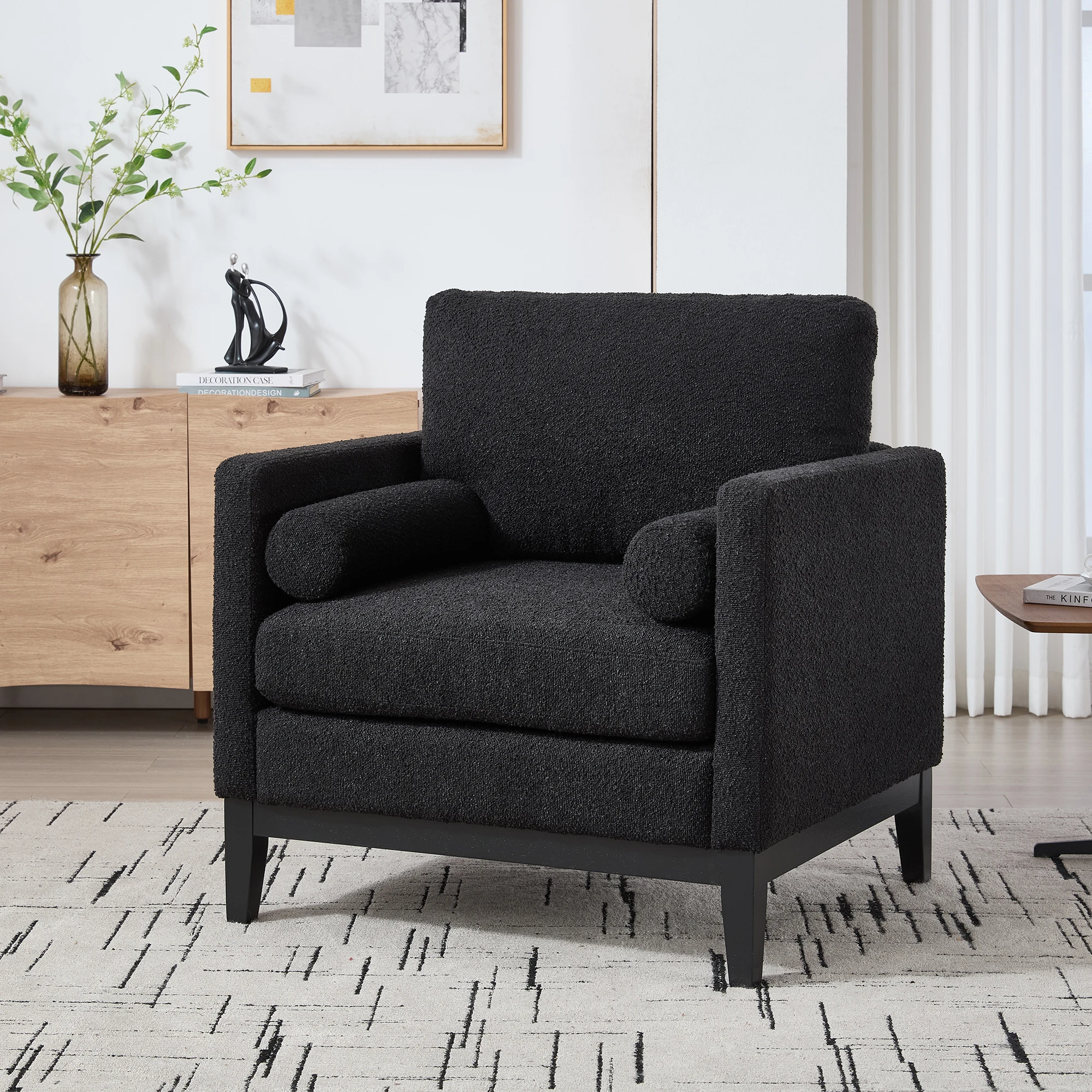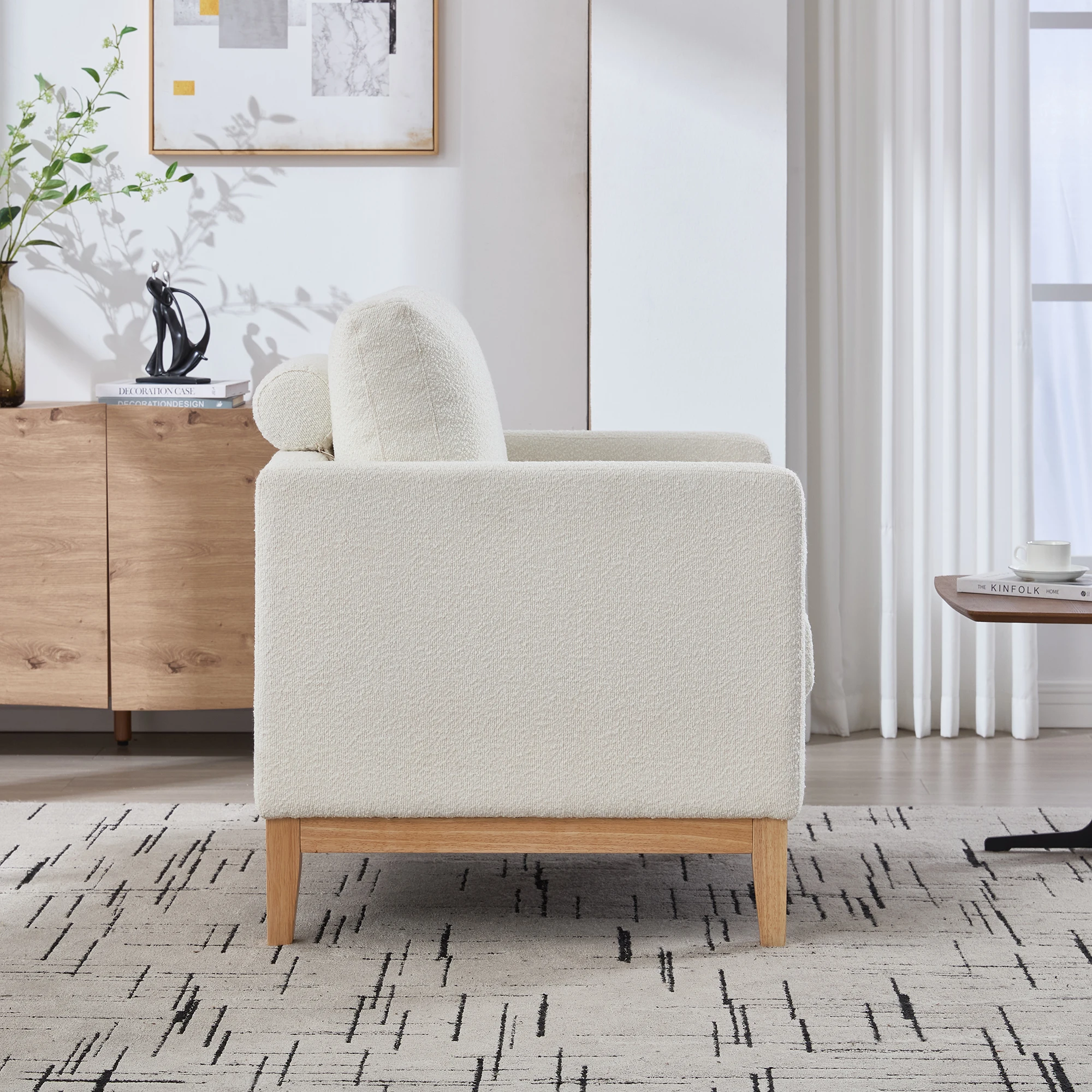 Modern Farmhouse Performance Accent Chair with Natural Wood Legs, Wood Base Reading Armchair Single Sofa with Two Bolster Pillow