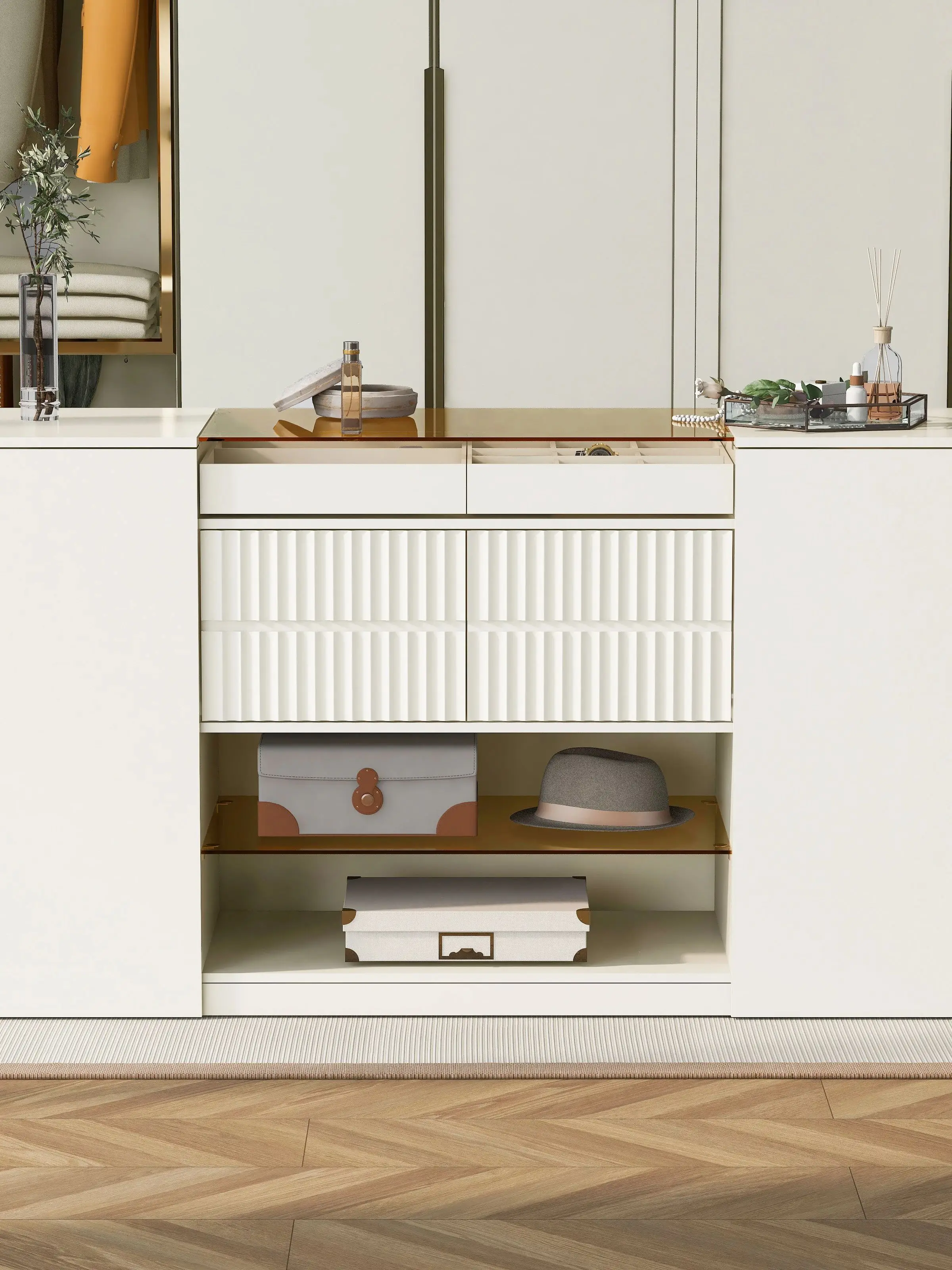 Modern Luxury Multi-Functional Island Vanity Dresser and Storage Cabinet with Glass Tabletop, Display Shelf, 6 Drawers