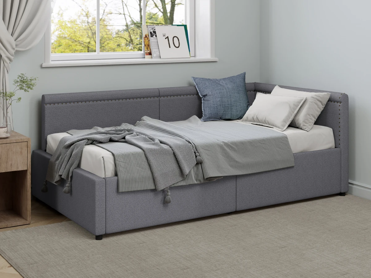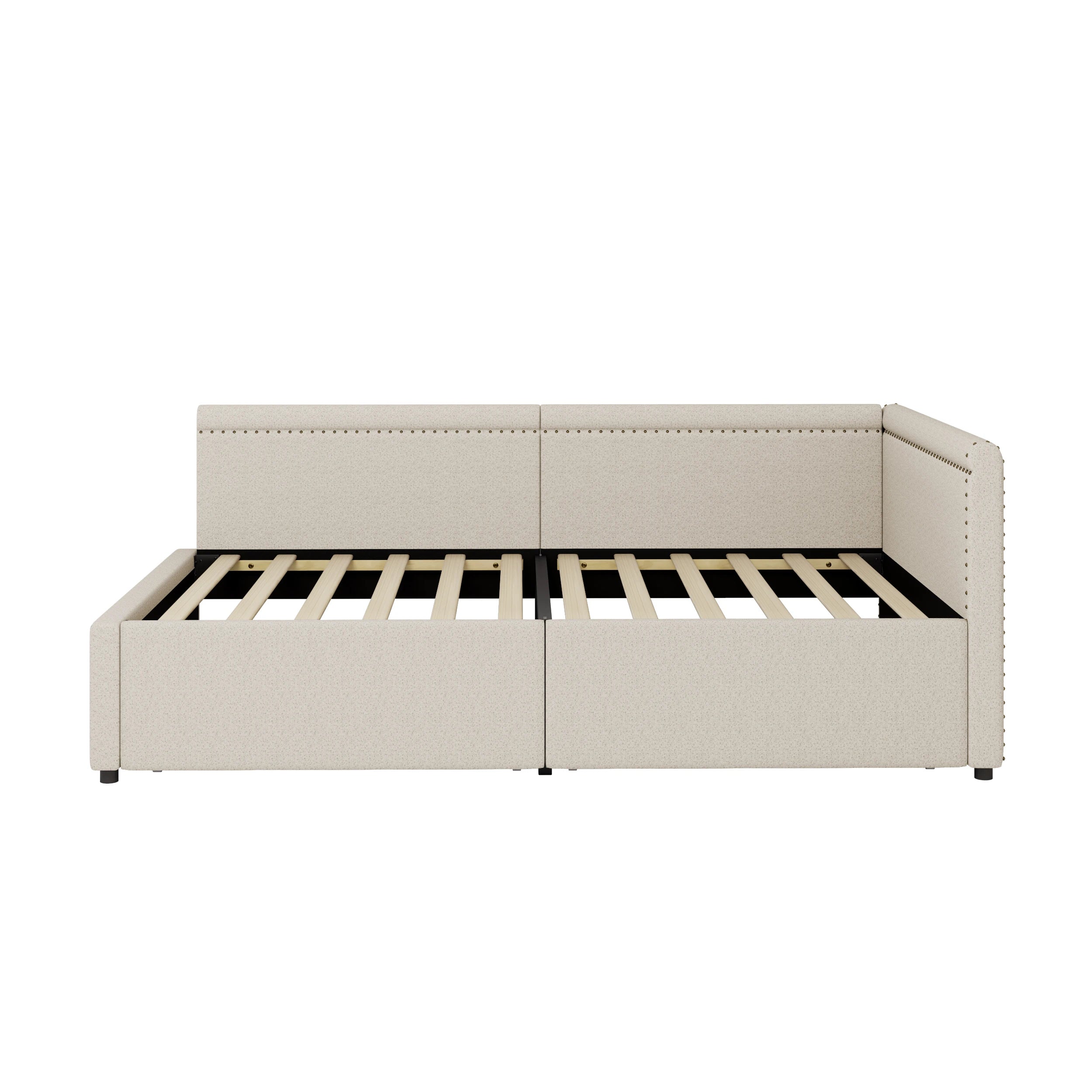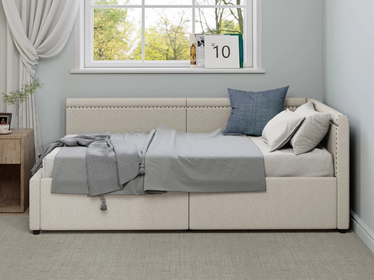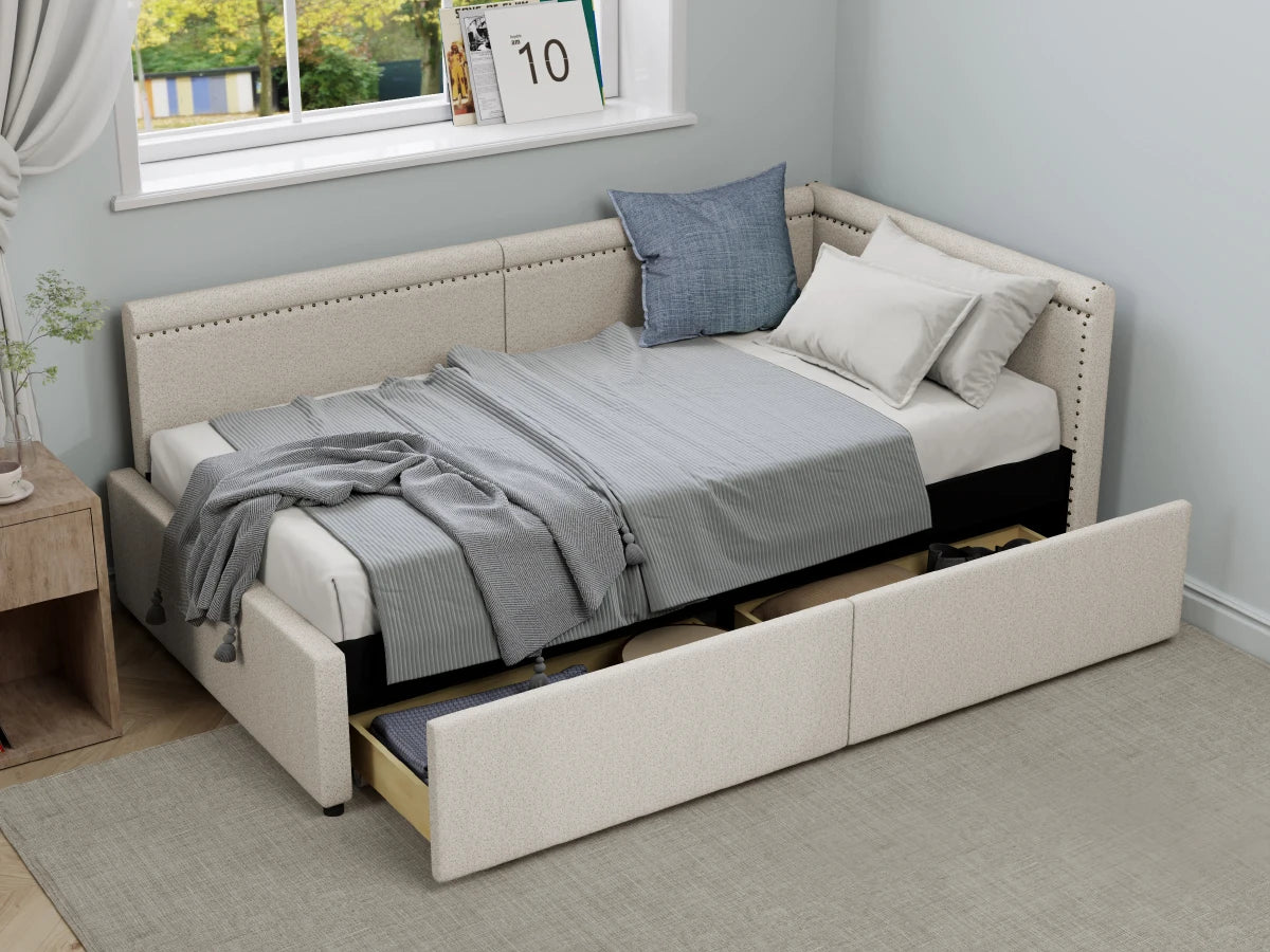 Modern Style Twin Size L Shape Corner Bed, Linen Upholstered Daybed with Two Storage Drawers