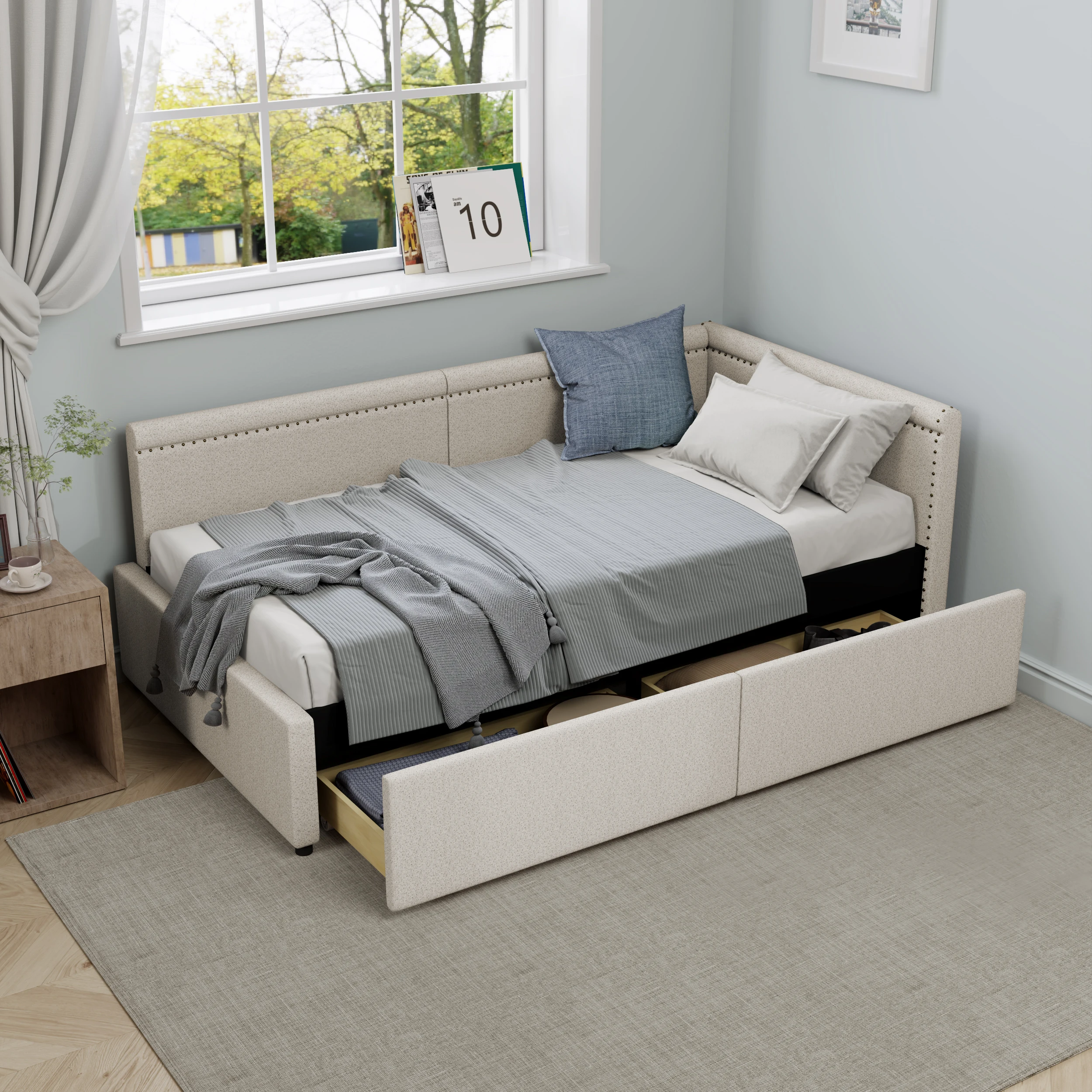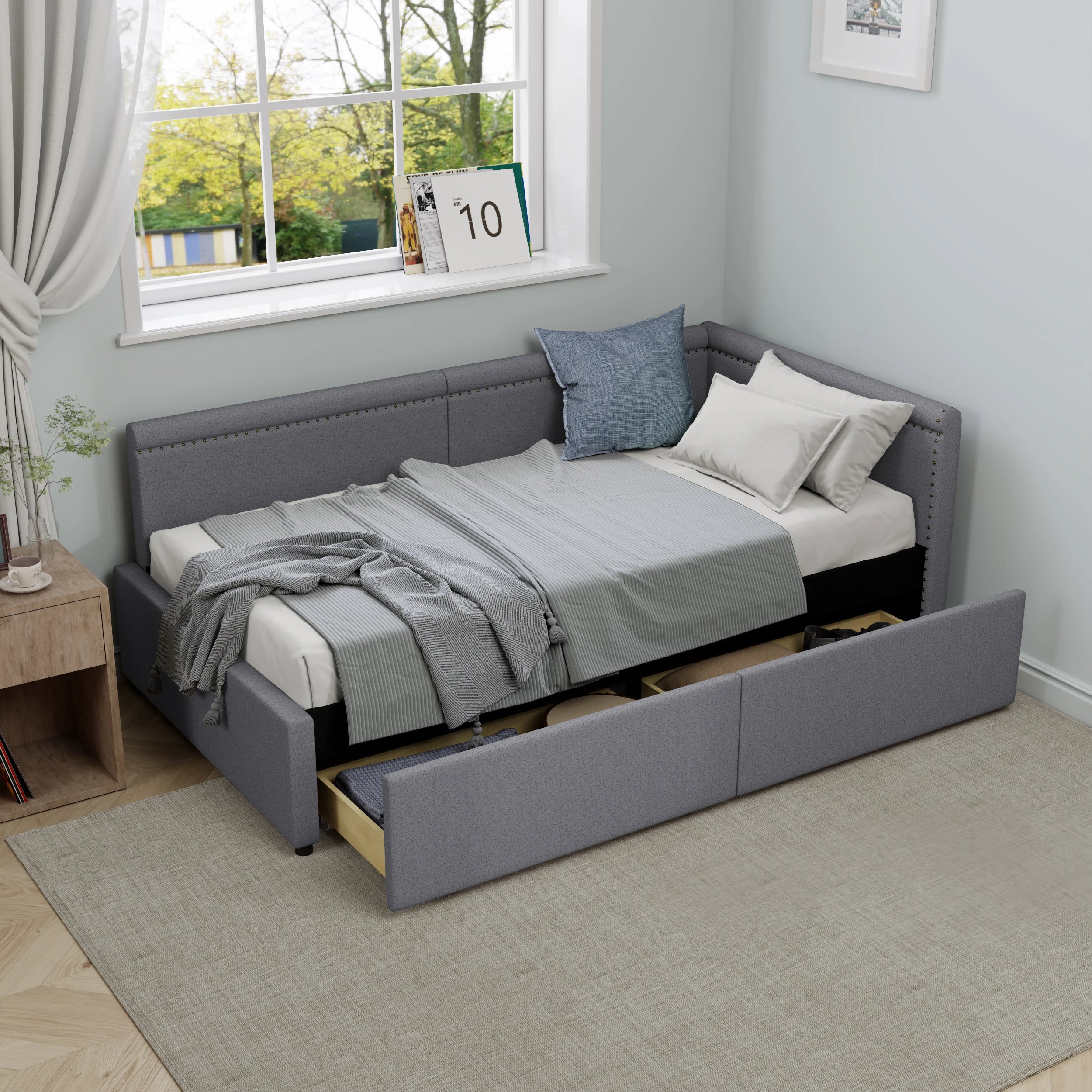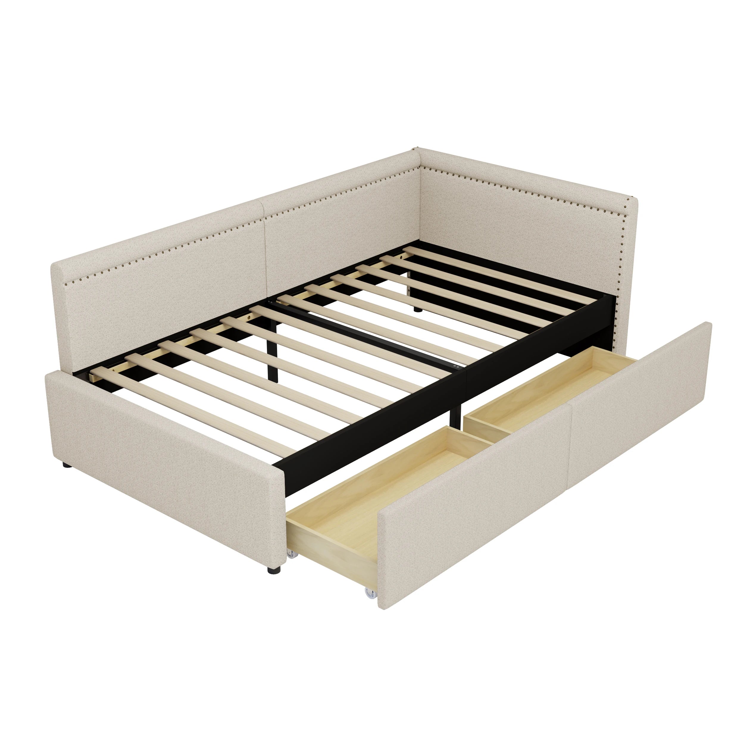 Modern Style Twin Size L Shape Corner Bed, Linen Upholstered Daybed with Two Storage Drawers