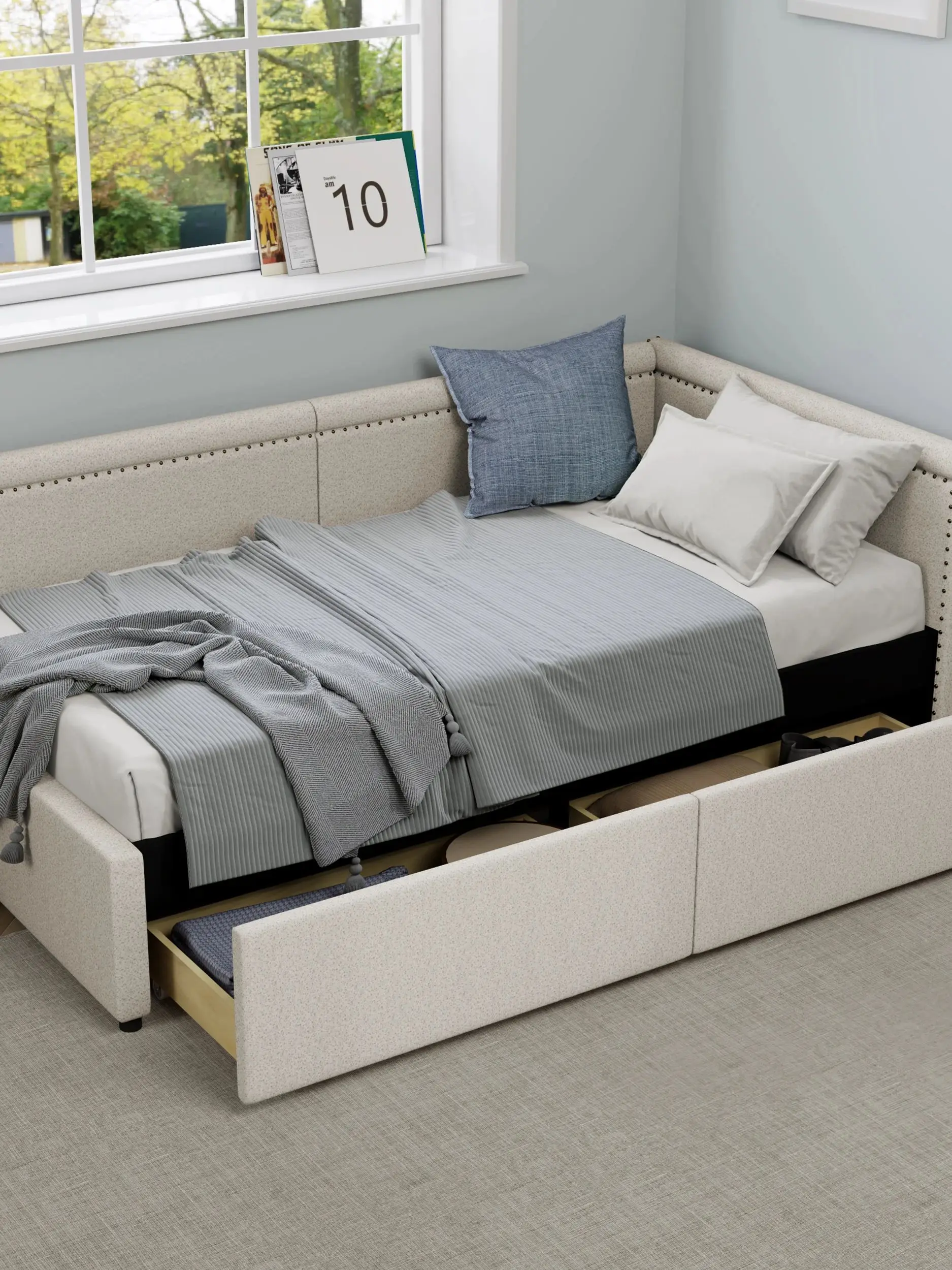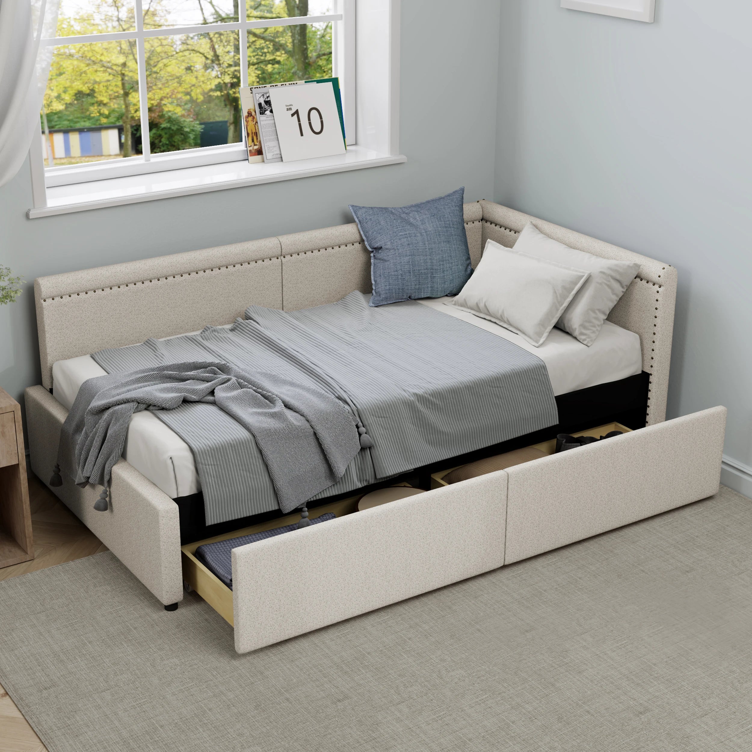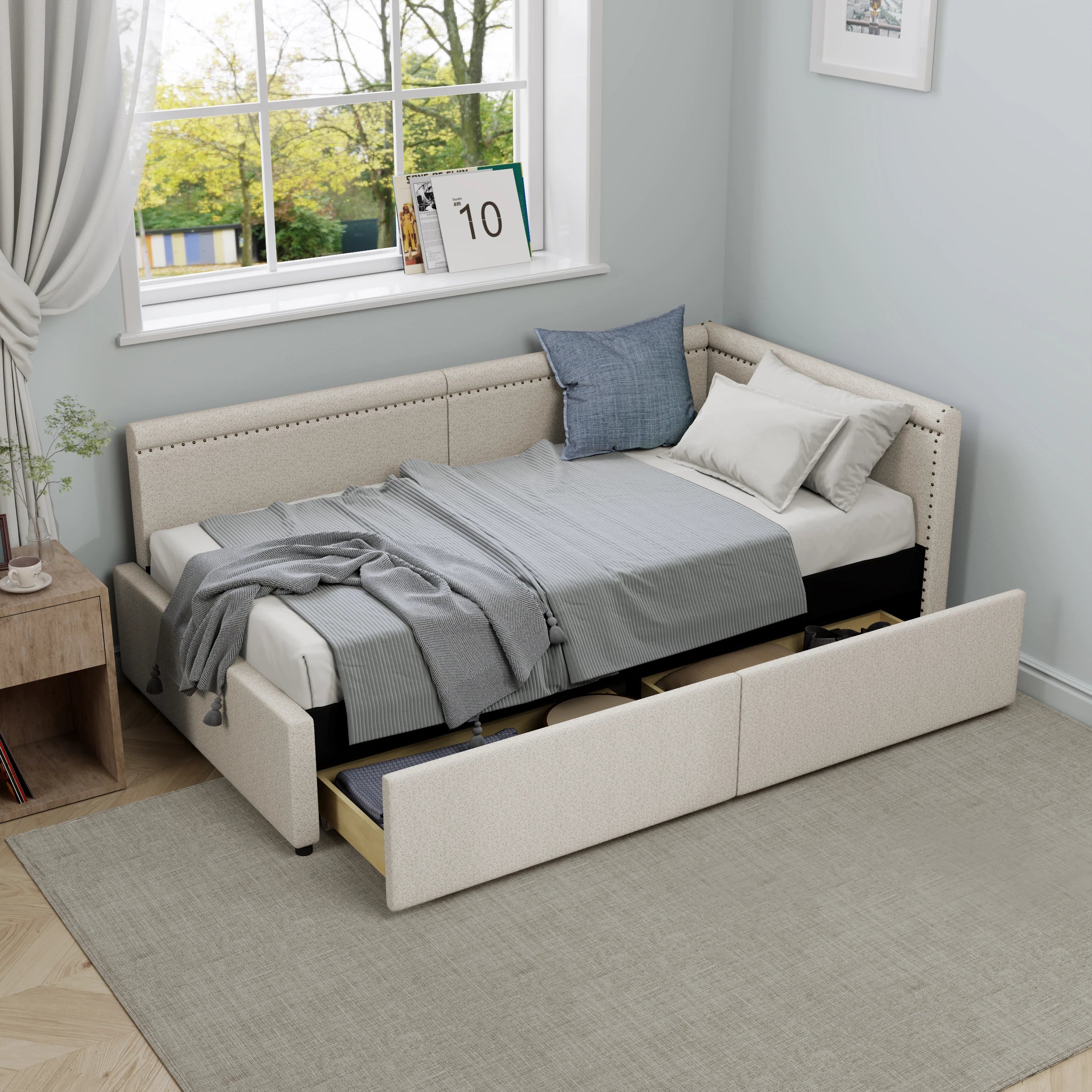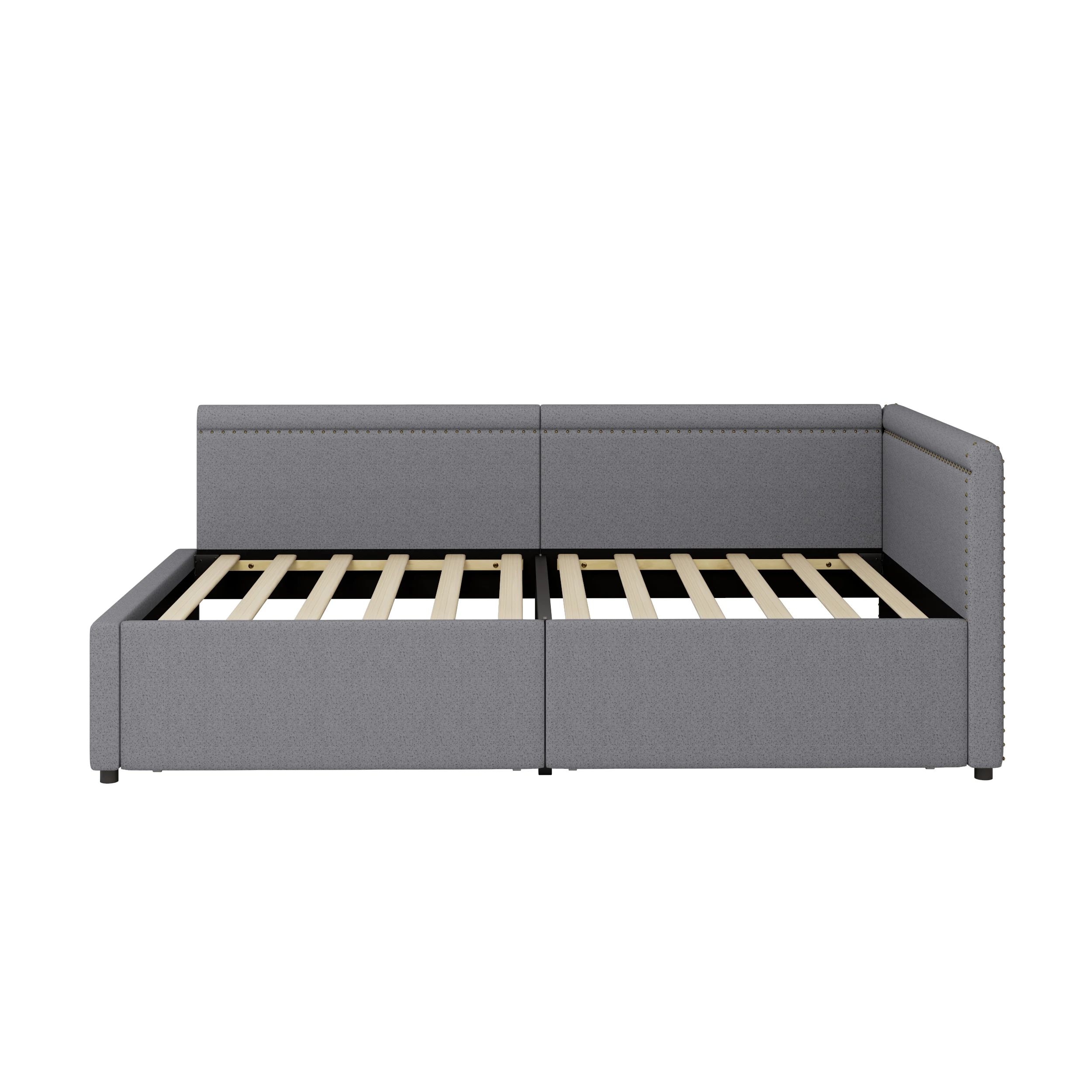 Modern Style Twin Size L Shape Corner Bed, Linen Upholstered Daybed with Two Storage Drawers