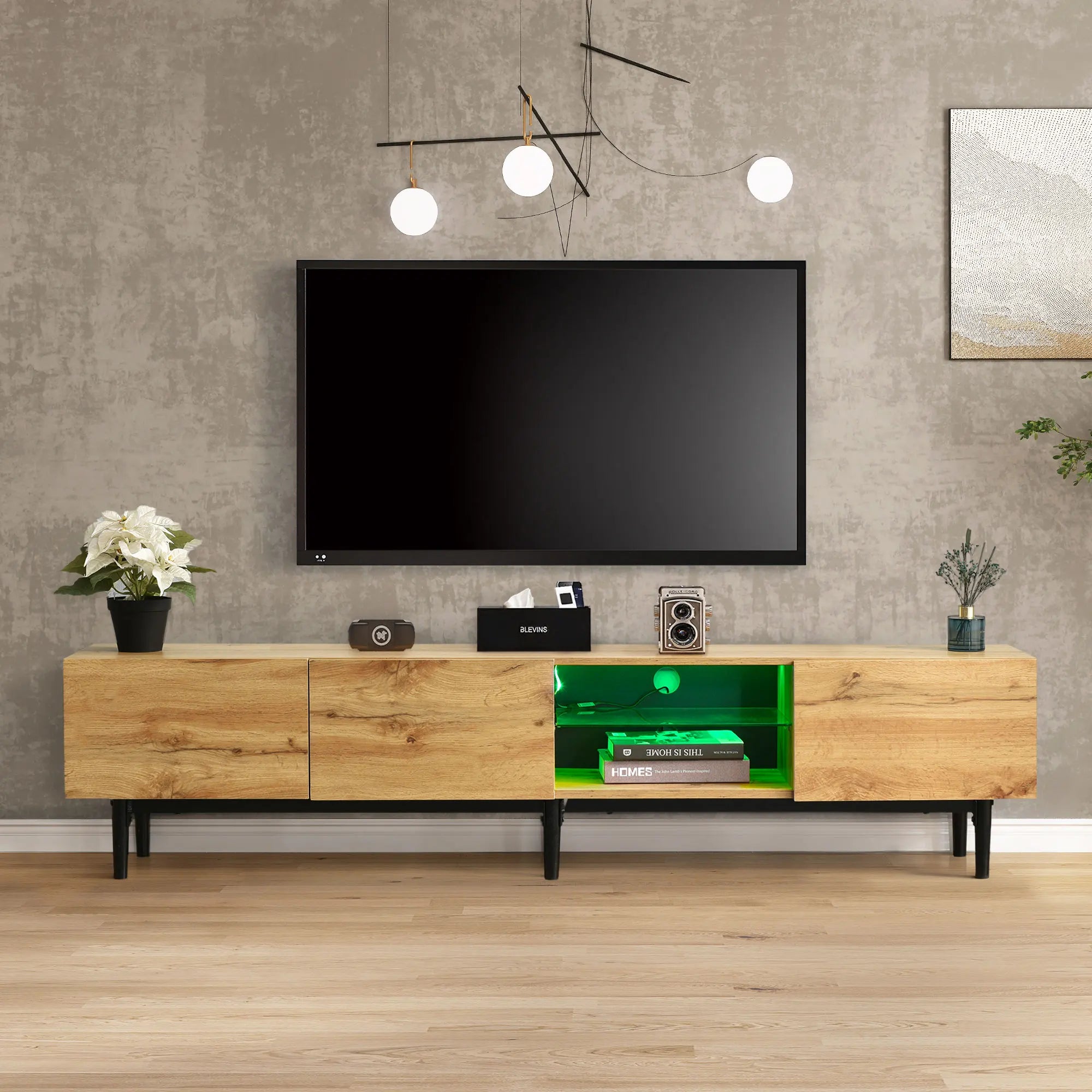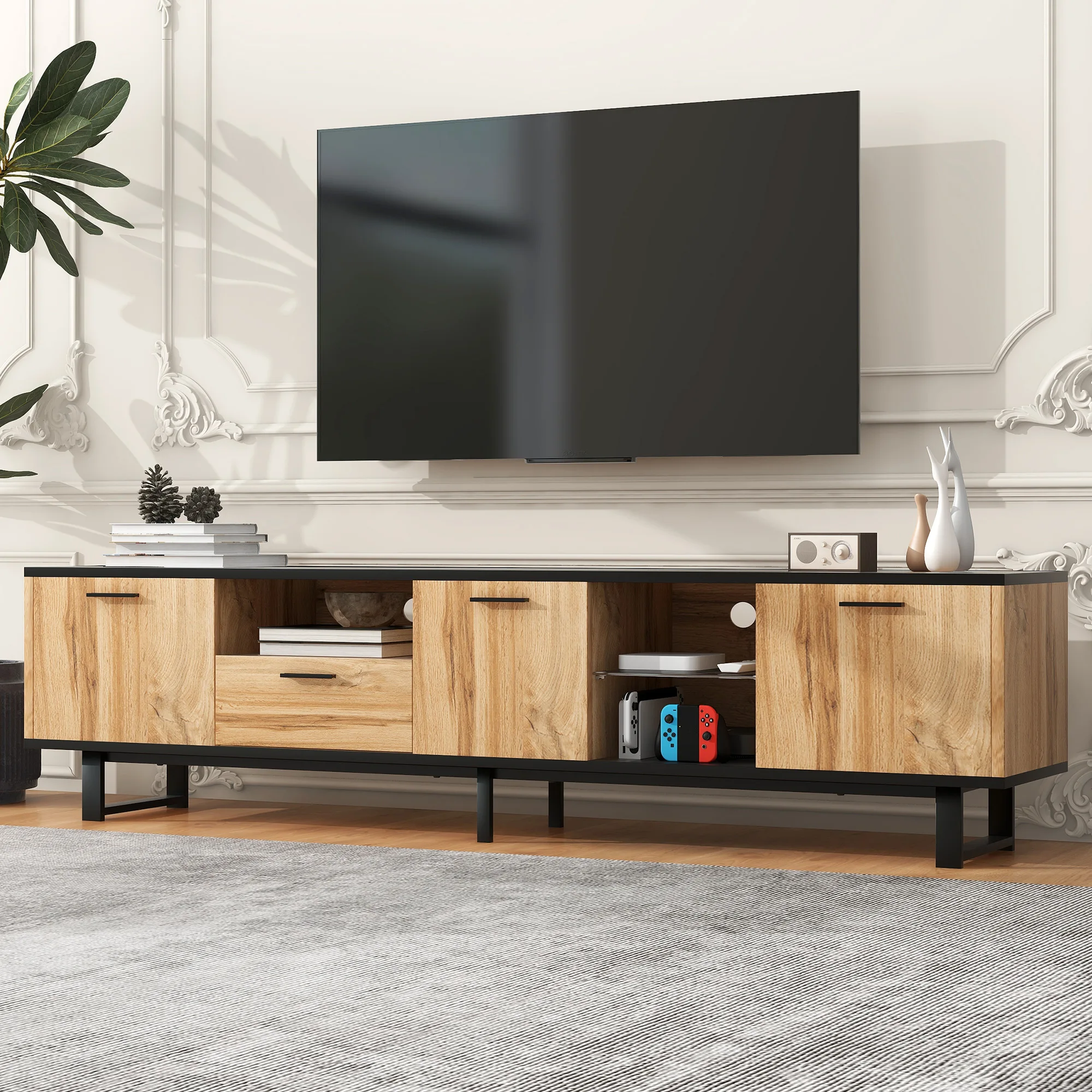 Modern TV Stand with 4 Cabinets& Open Shelves, Color-matching Media Console Table for TVs up to 80'