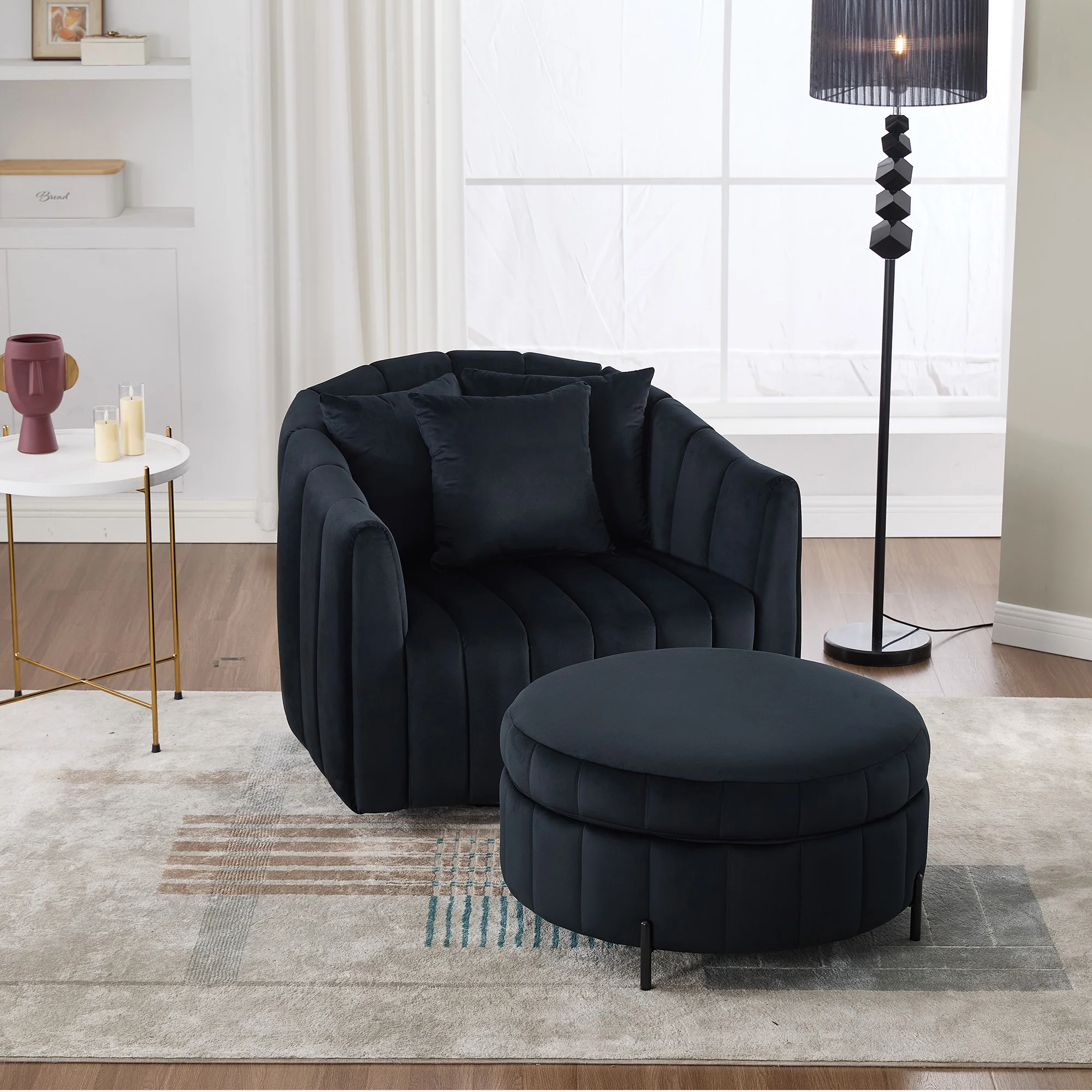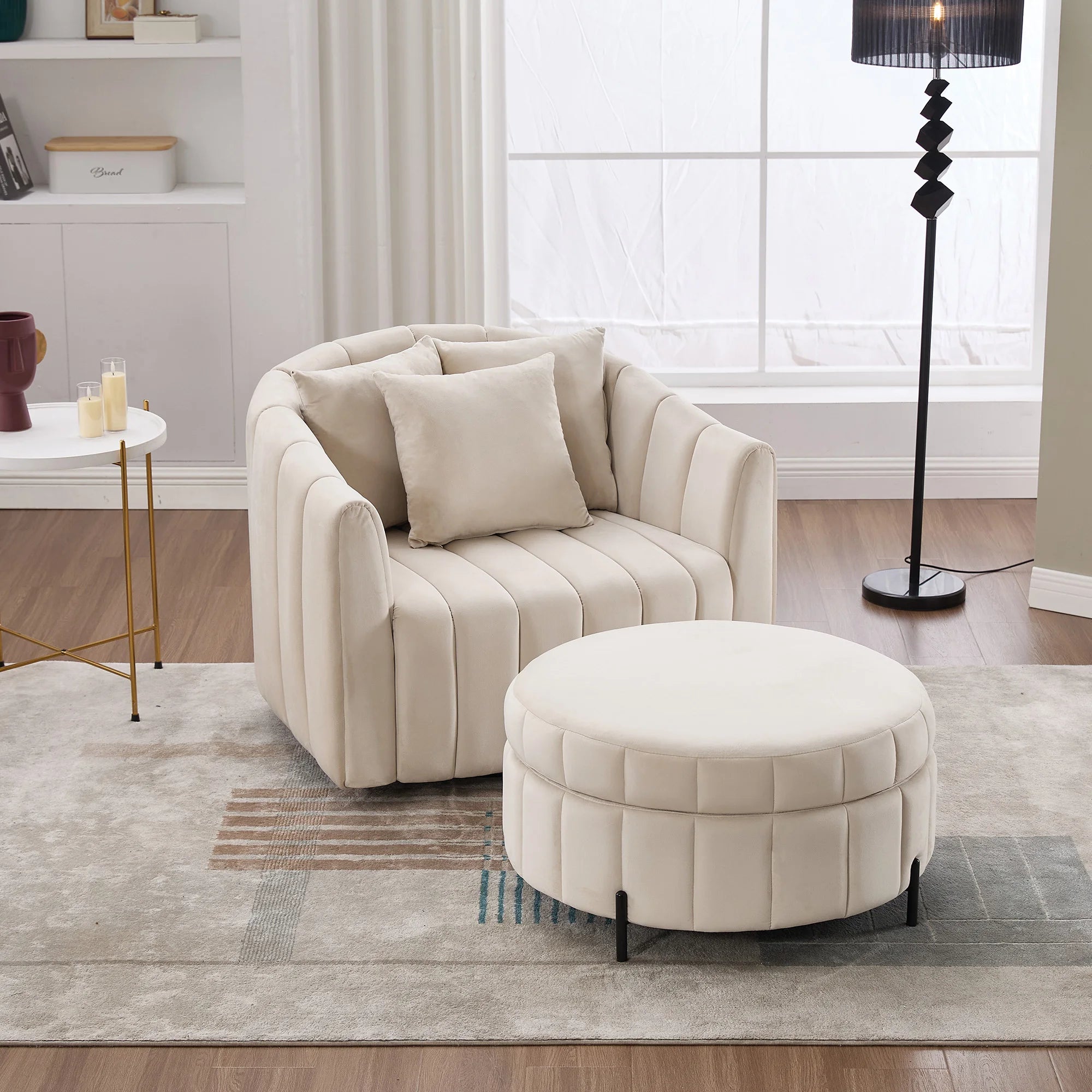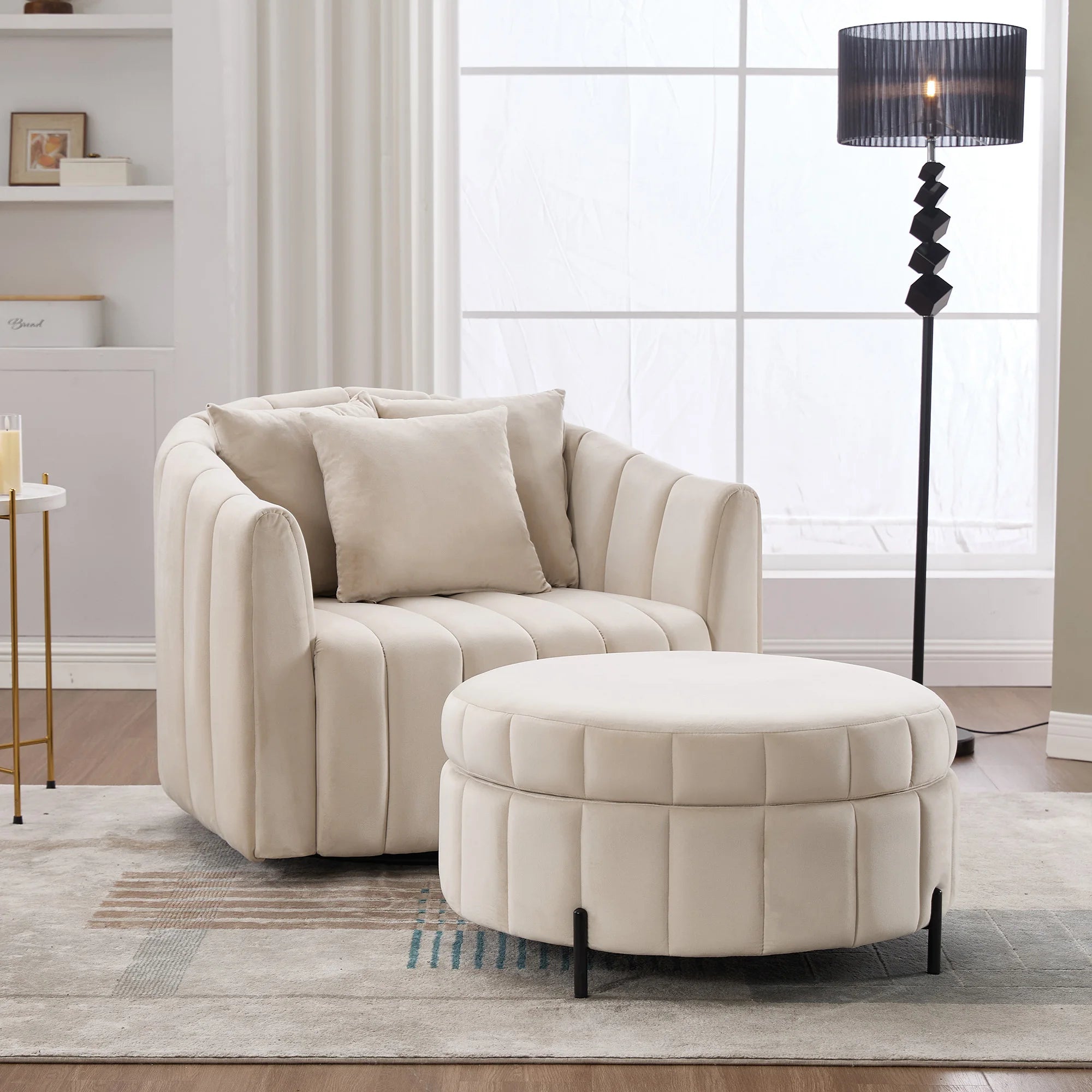 Oversized 360° Swivel Accent Barrel Chair and Half Sofa with Ottoman, Velvet Channel Tufted Pumpkin-Shape Club Armchair.