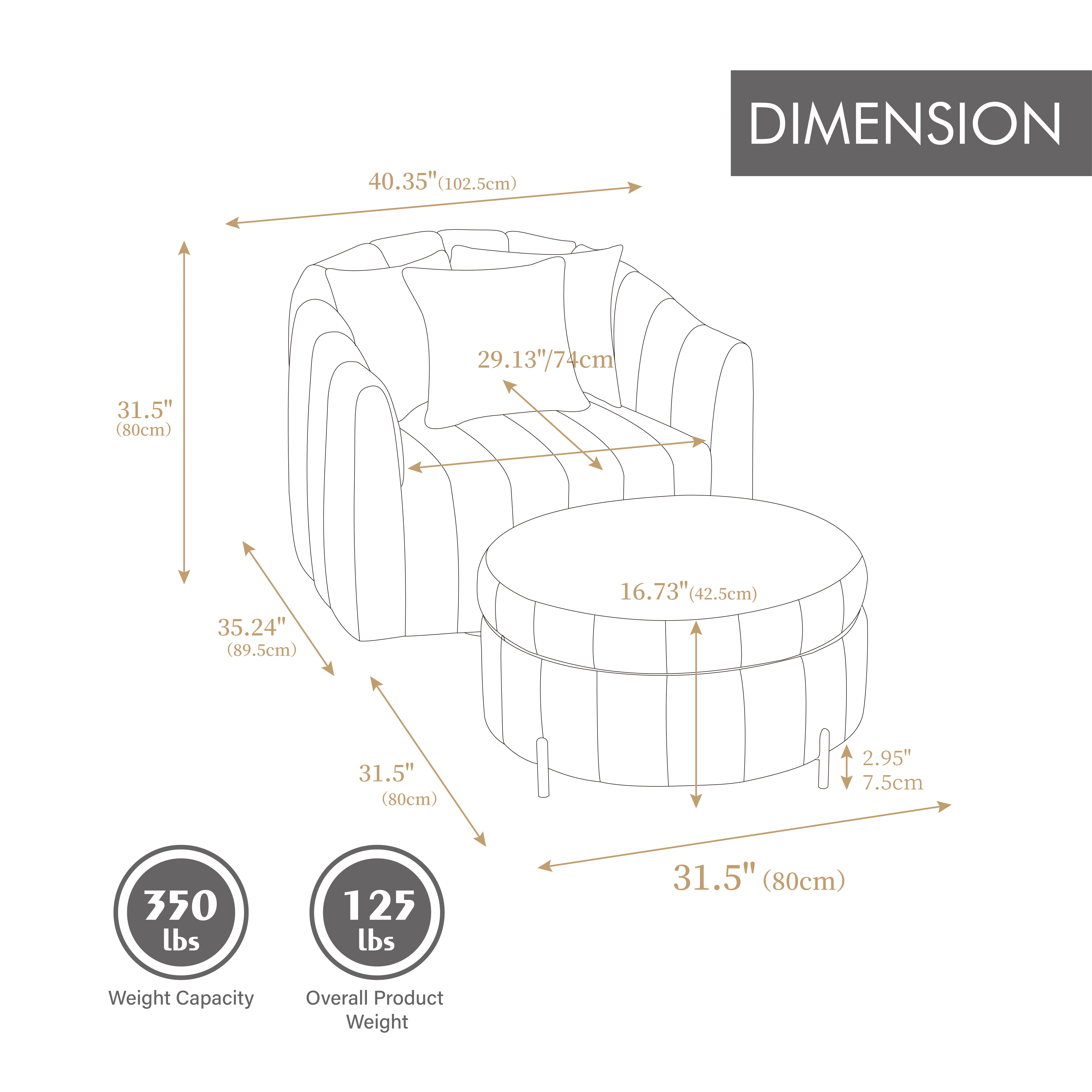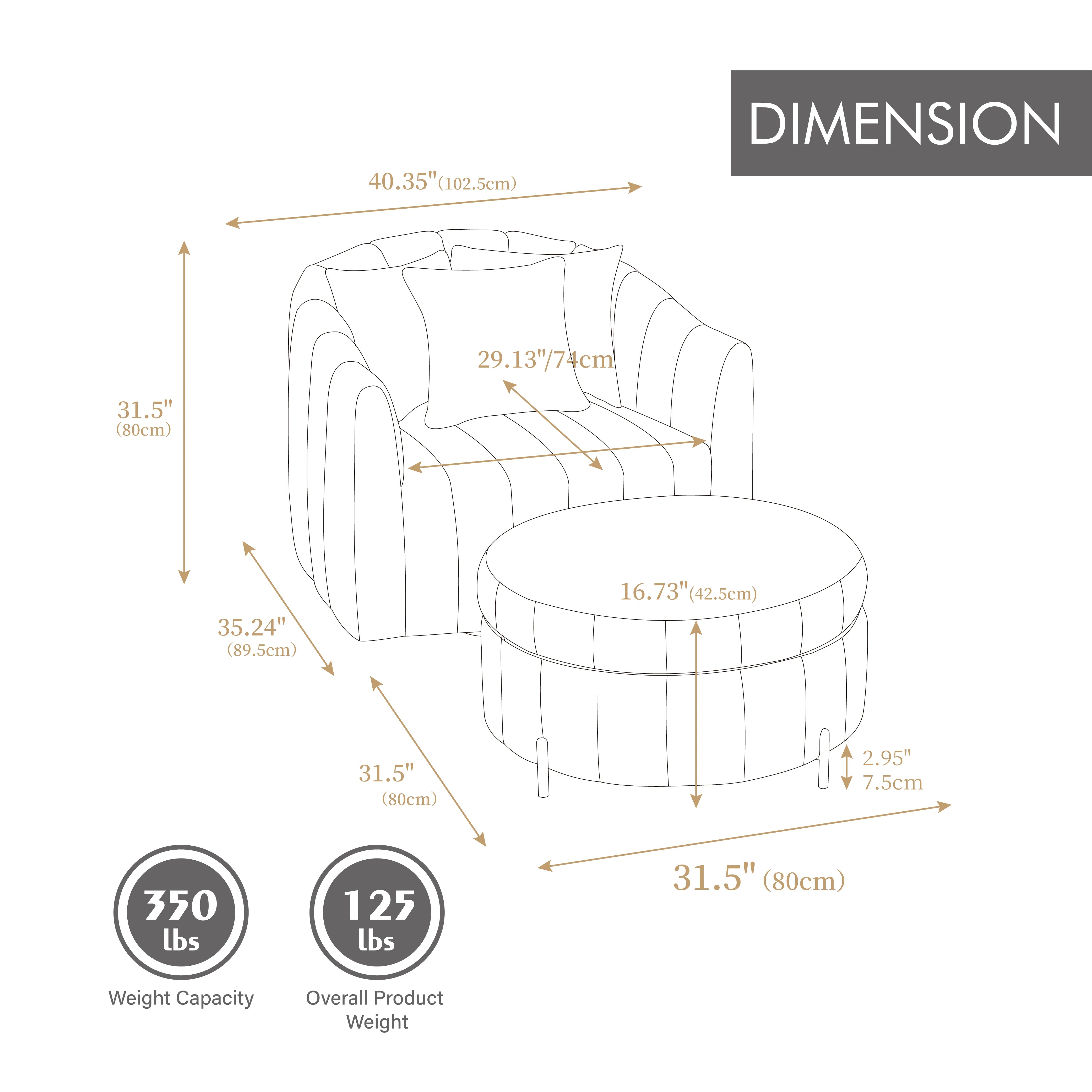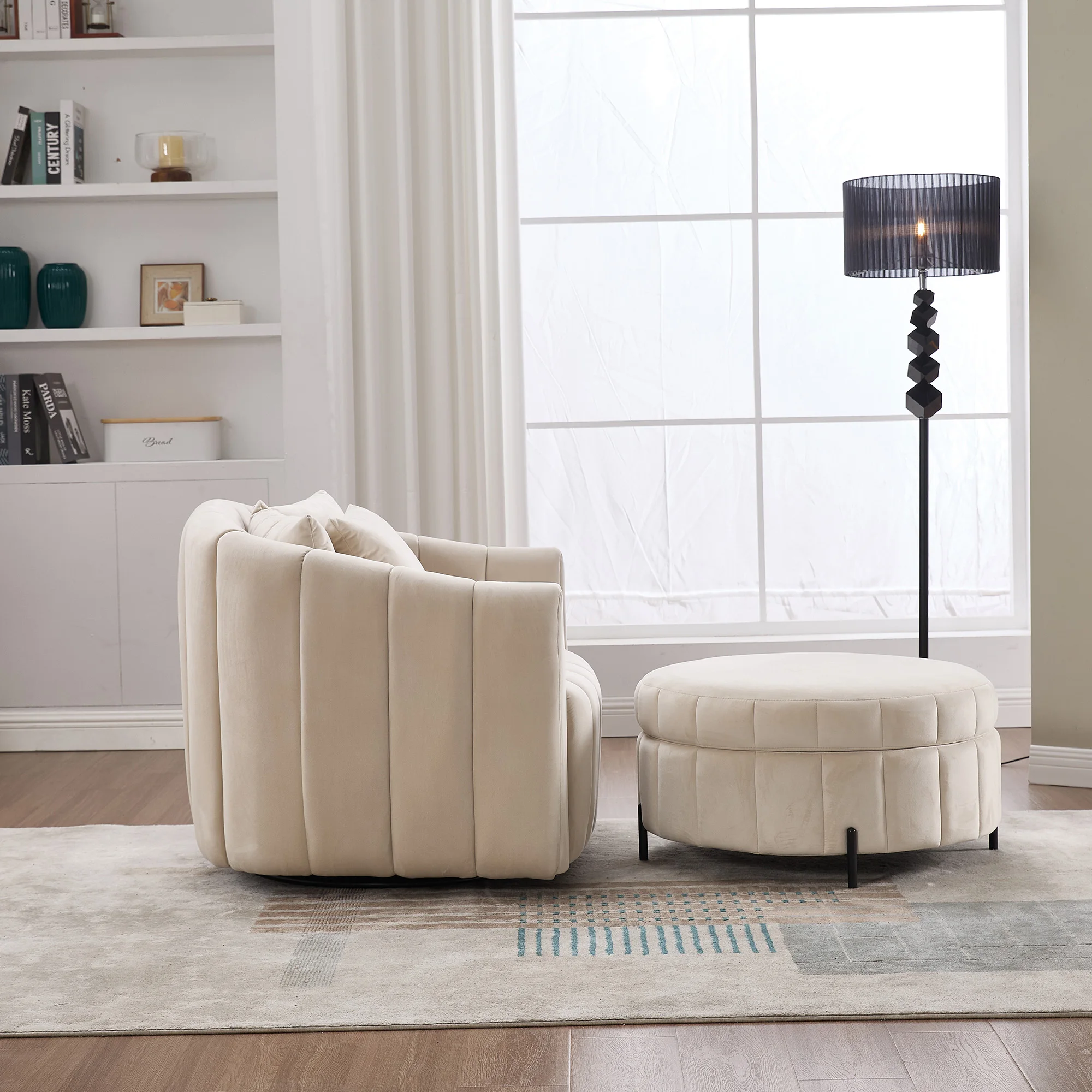 Oversized 360° Swivel Accent Barrel Chair and Half Sofa with Ottoman, Velvet Channel Tufted Pumpkin-Shape Club Armchair.