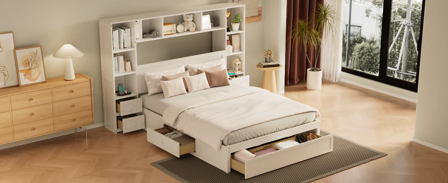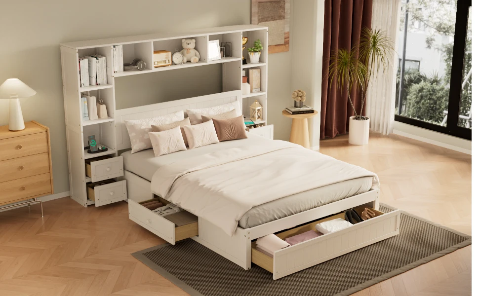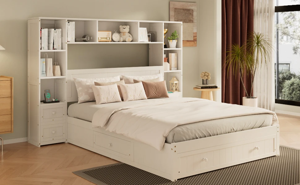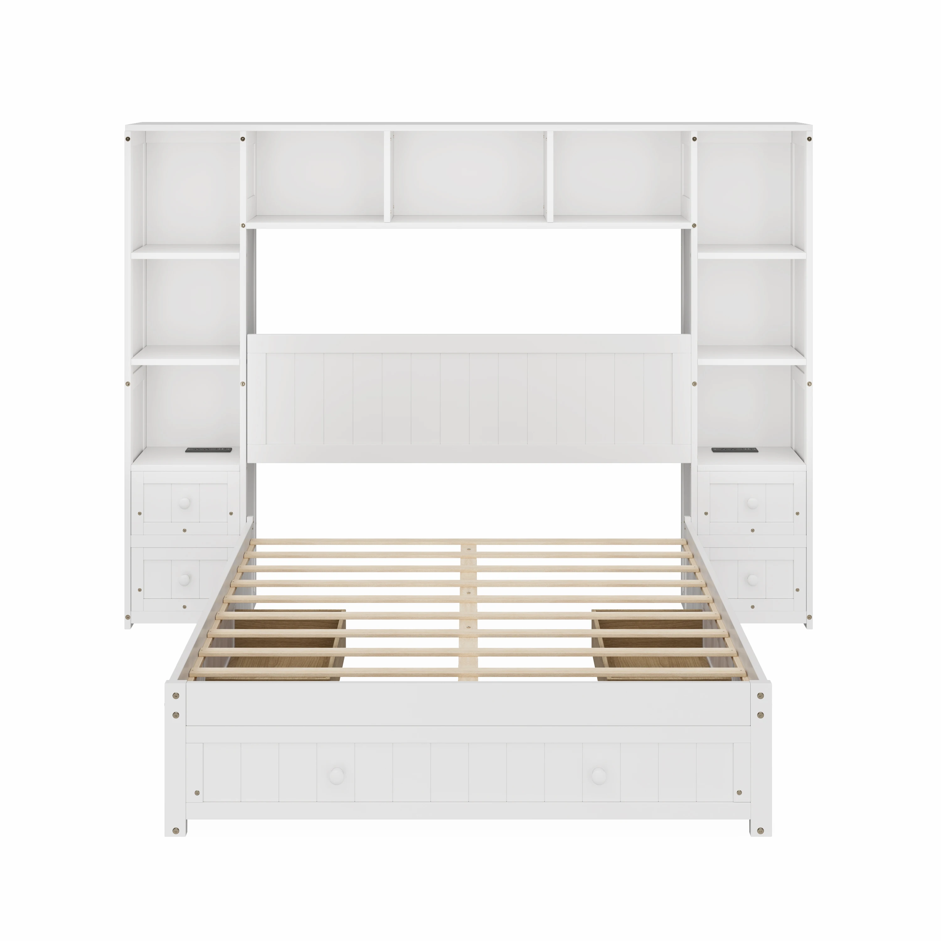 Queen Size Pine Wood Platform Bed with All-In-One 2 Nightstand, Storage Shelf and Cabinet Bookcase with 2 Charging Stations