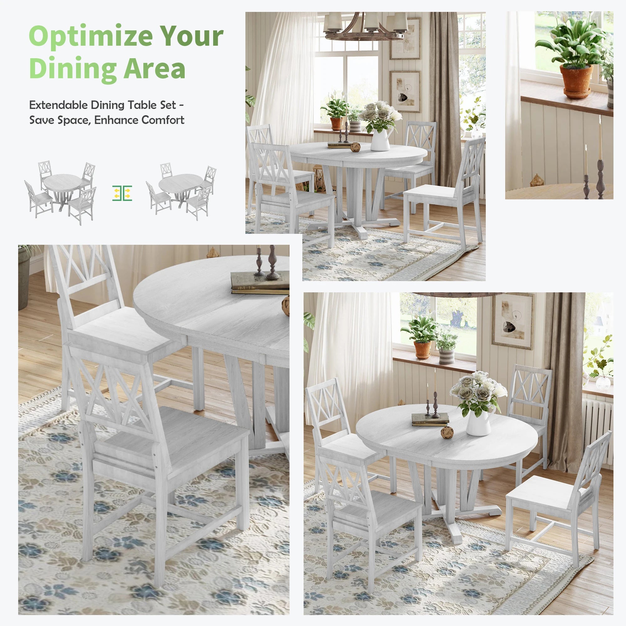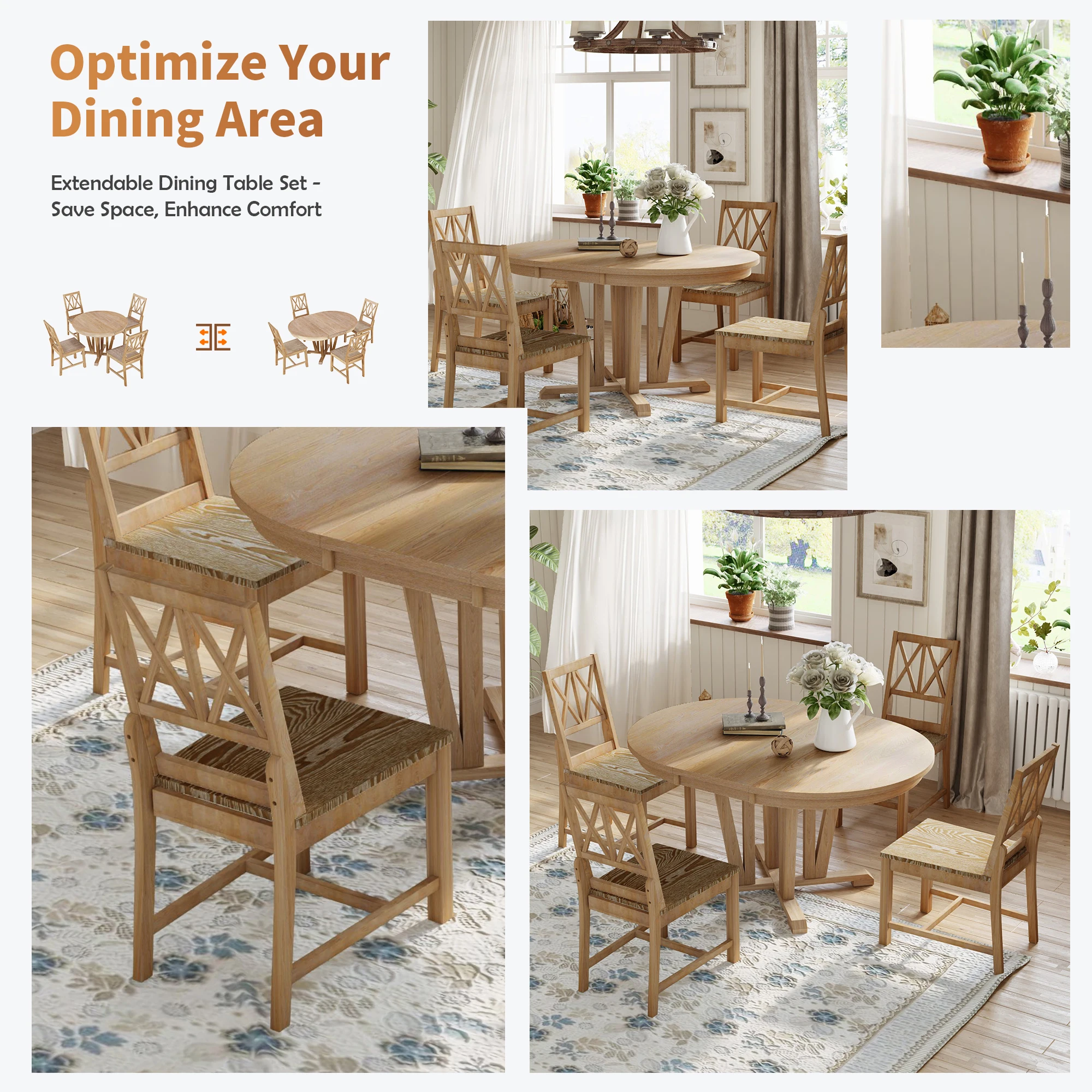 Rustic 5-Piece Extendable Dining Table Set Round Trestle Table and 4 Cross Back Dining Chairs for Kitchen, Dining Room