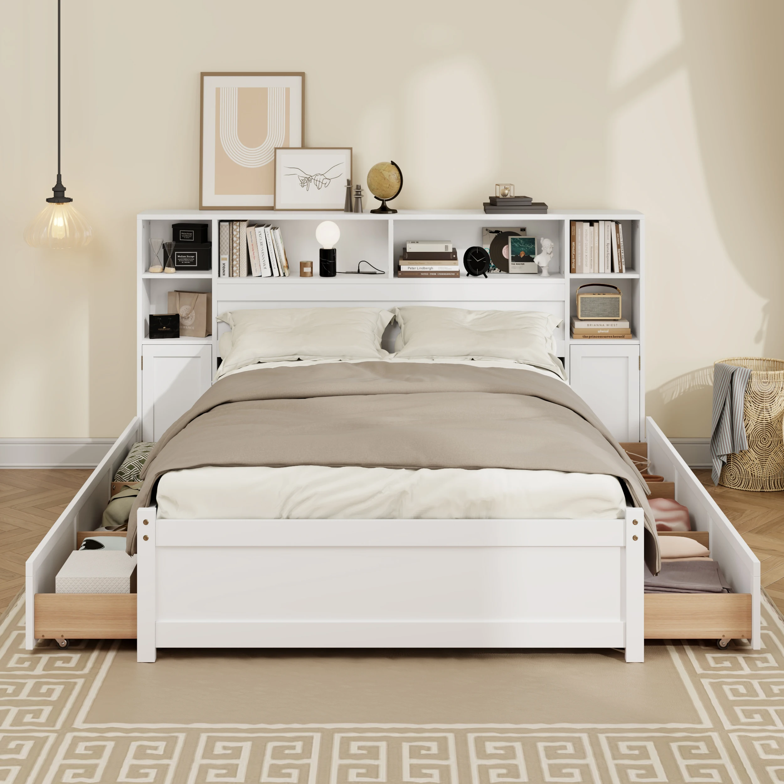 White Wooden Storage Bed with Tall Extended Bookcase Headboard, 6 Drawers and Charging Station for Teens Adults