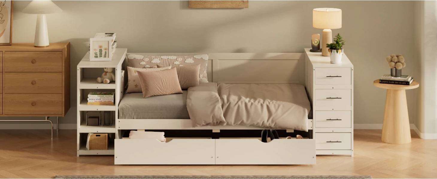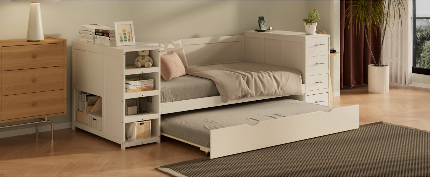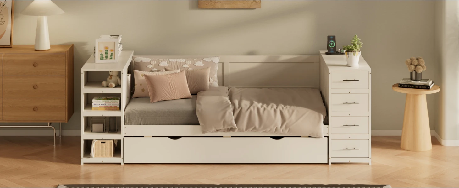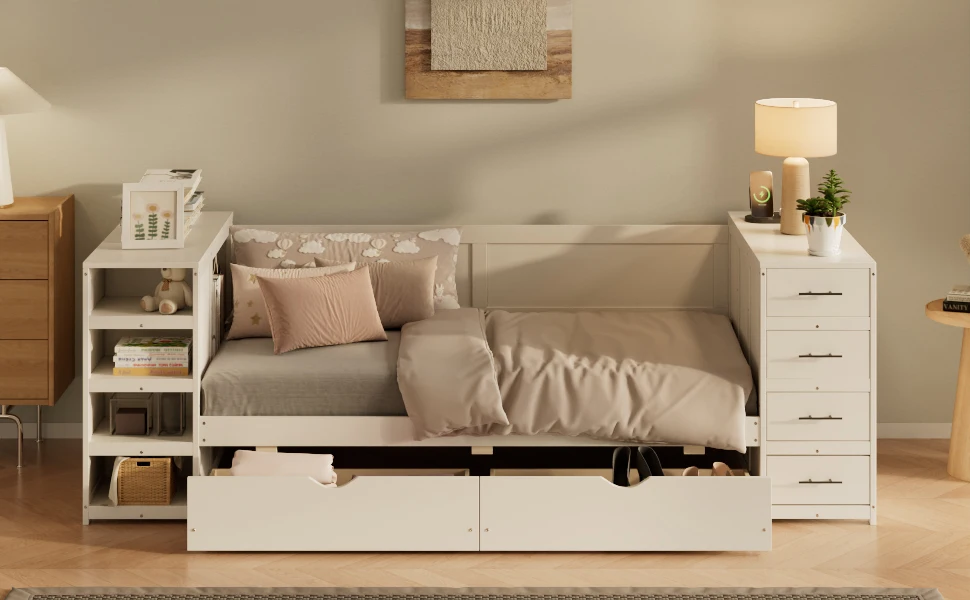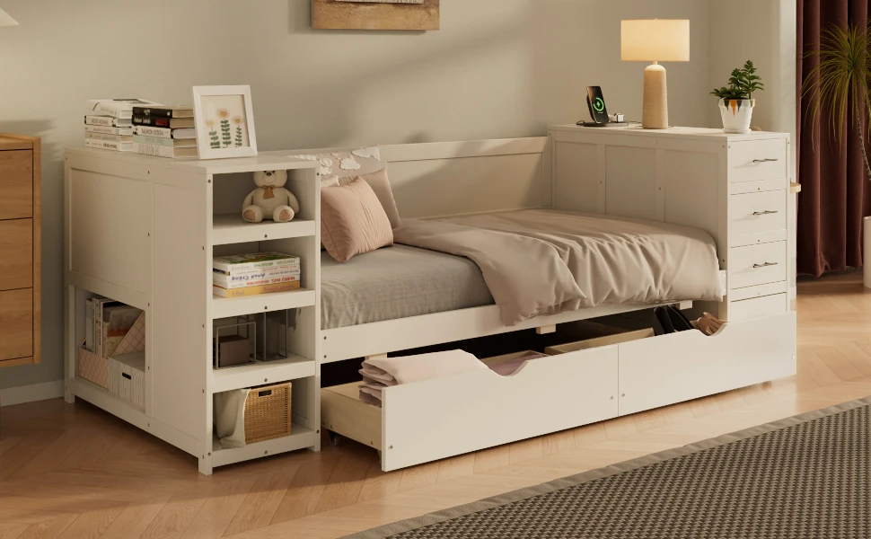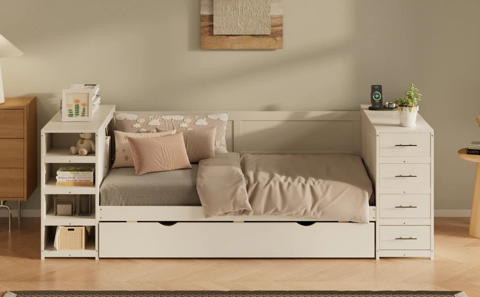 White Wooden Twin Size Daybed with Trundle, Side Shelves, Drawers, Desk & Charging Station